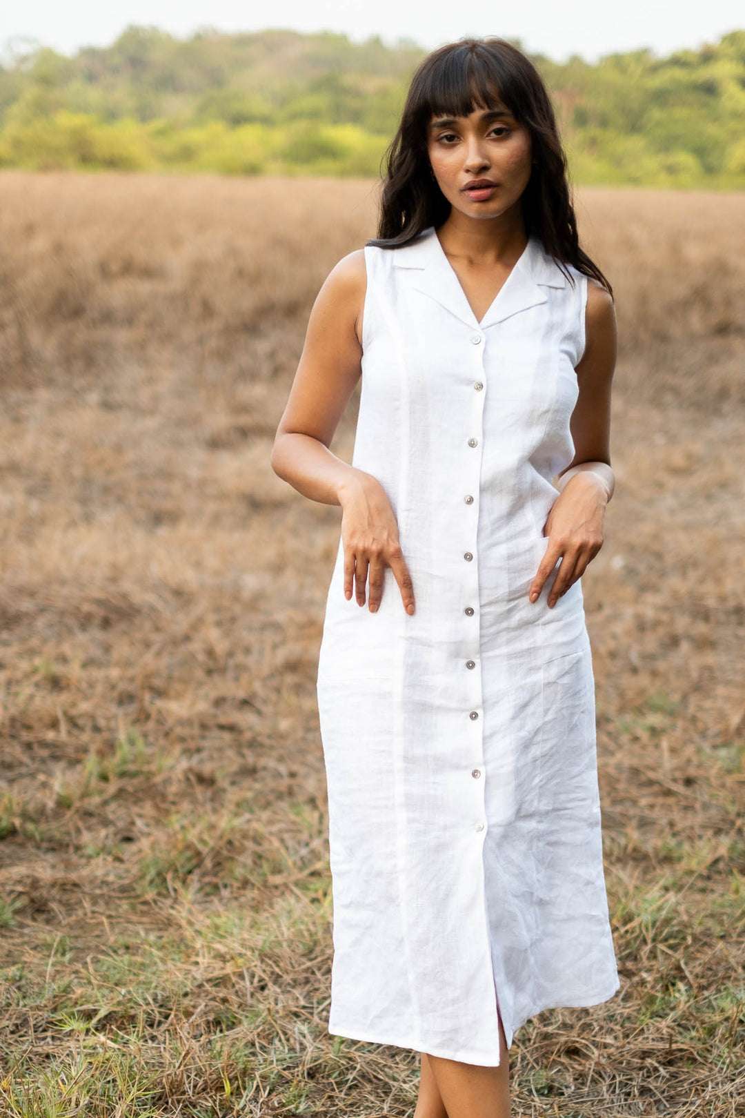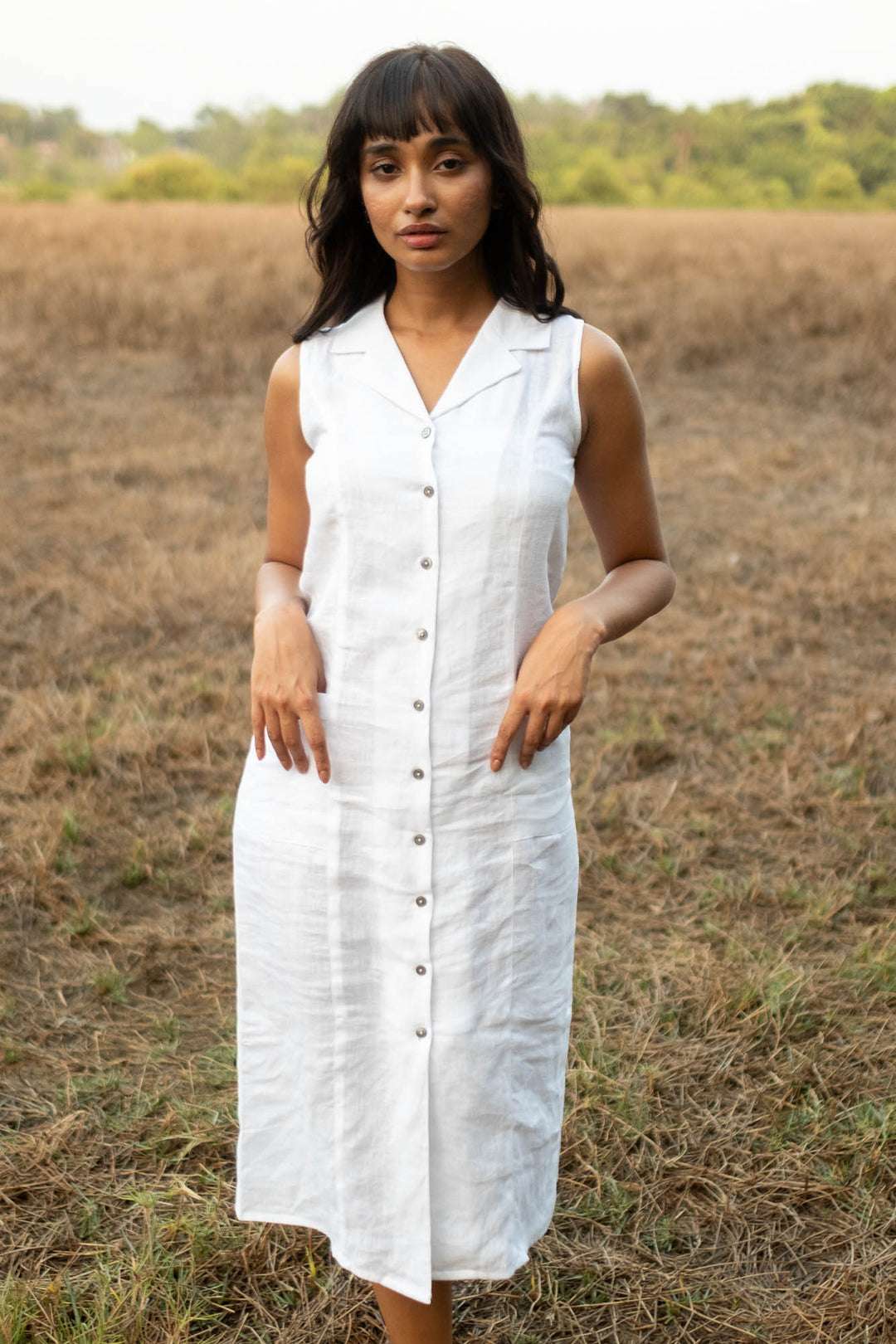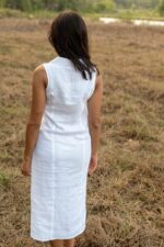 Women’s Cotton Solid Oversized Fit Spread Collar Sleeveless Dresses ( White )