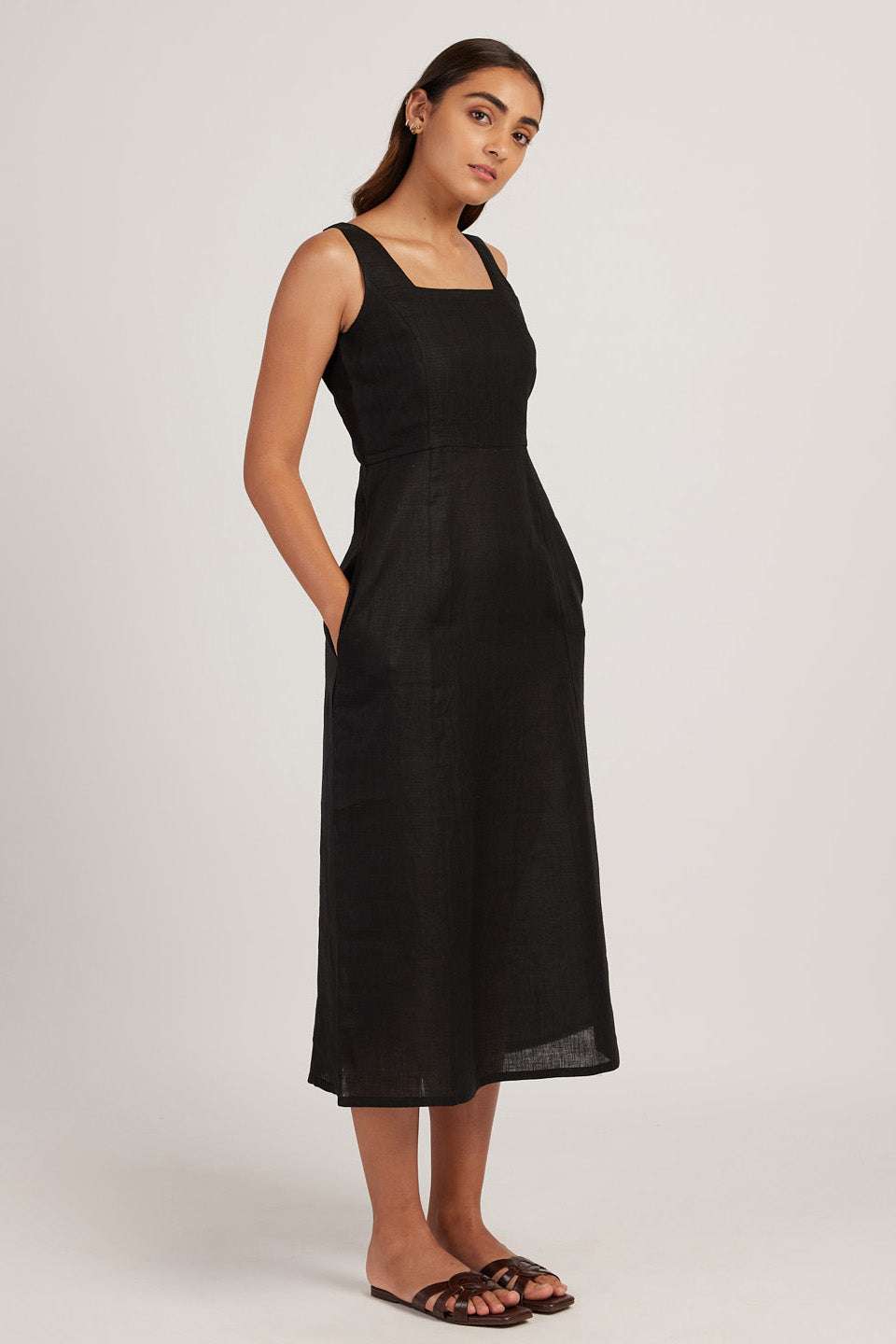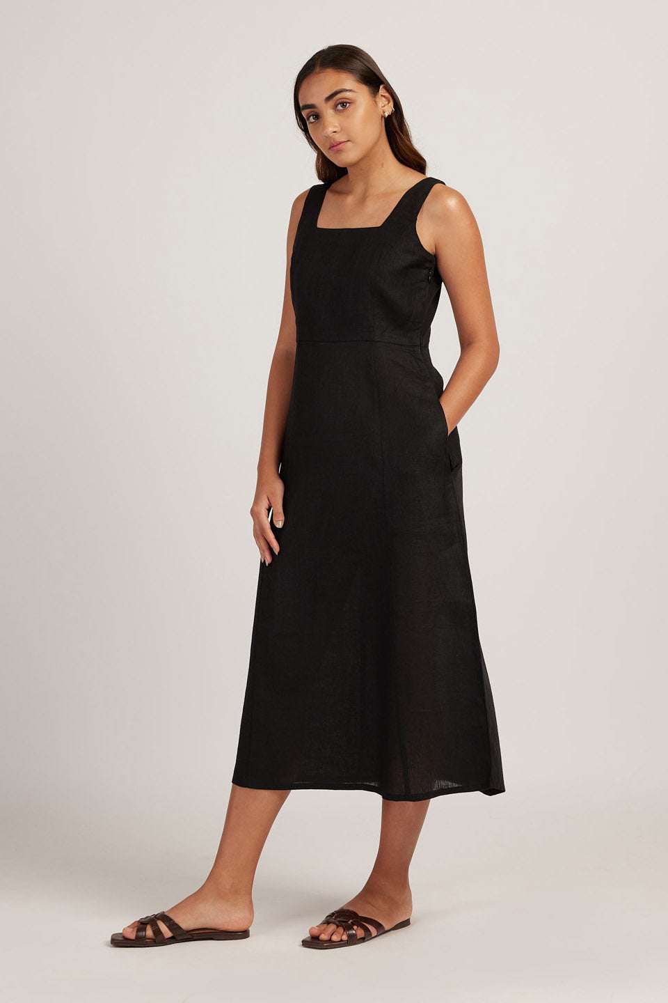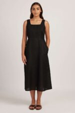 Women’s Cotton Solid Pain Sleeveless Midi Dress Stylish Western One Piece Casual Empire Dress ( Midnight Black )