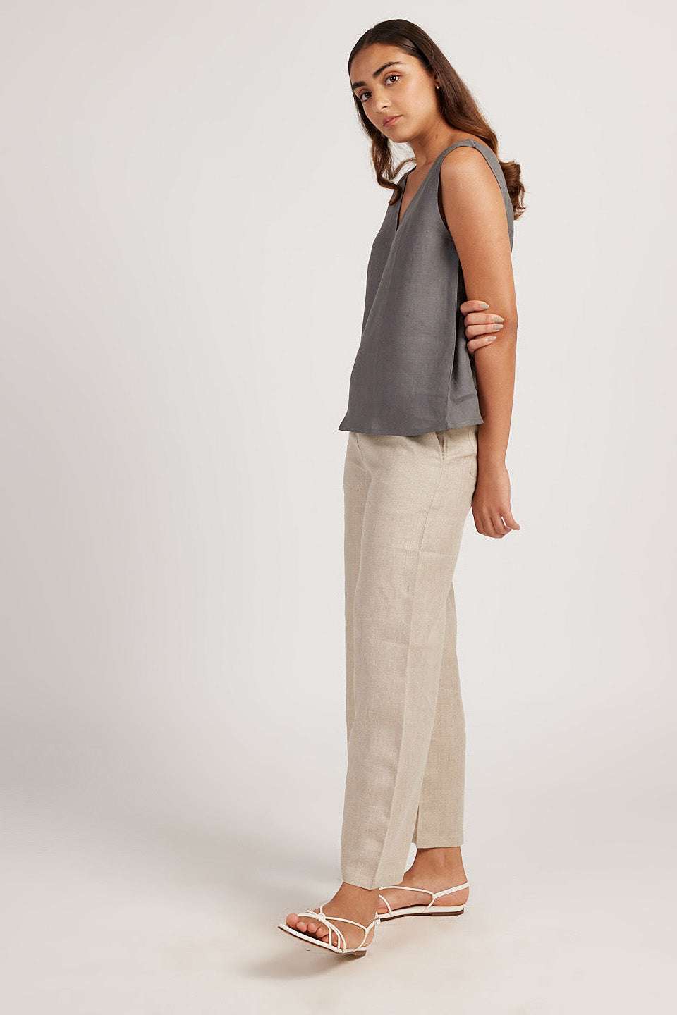 Women’s Cotton Solid V Neck Sleeveless 2 Piece Outfit Loose Tank Top and Wide Leg Palazzo Pants Sets cord set ( Grey Beige )