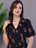 Women’s Elegant Indigo & Orange Floral Block Print Cotton Shirt Dress