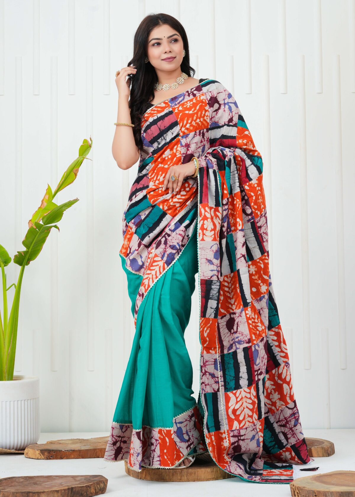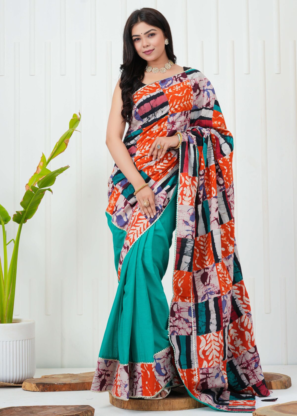Women’s Multicolor Patchwork Printed Saree with Green Base Blouse Piece Elegant Ethnic Wear