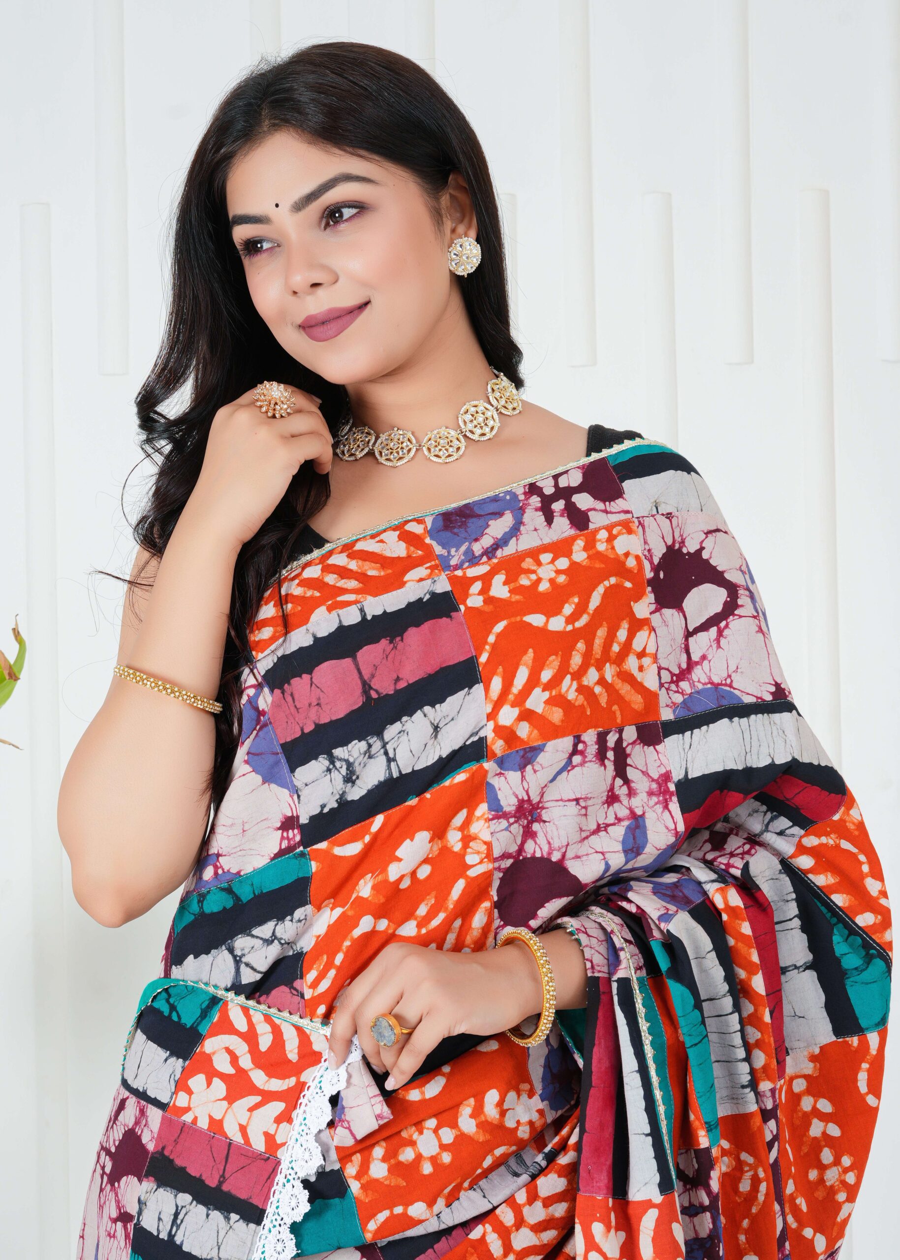 Ethnic wardrobe with this beautifully designed saree featuring an attractive patchwork-style printed pallu paired with a contrasting solid base. Crafted from soft and lightweight fabric, this saree offers a comfortable drape and a graceful fall, making it perfect for festive occasions, weddings, parties, and casual gatherings. The intricate printed patterns add a touch of elegance, while the included blouse piece allows you to customize your look effortlessly.