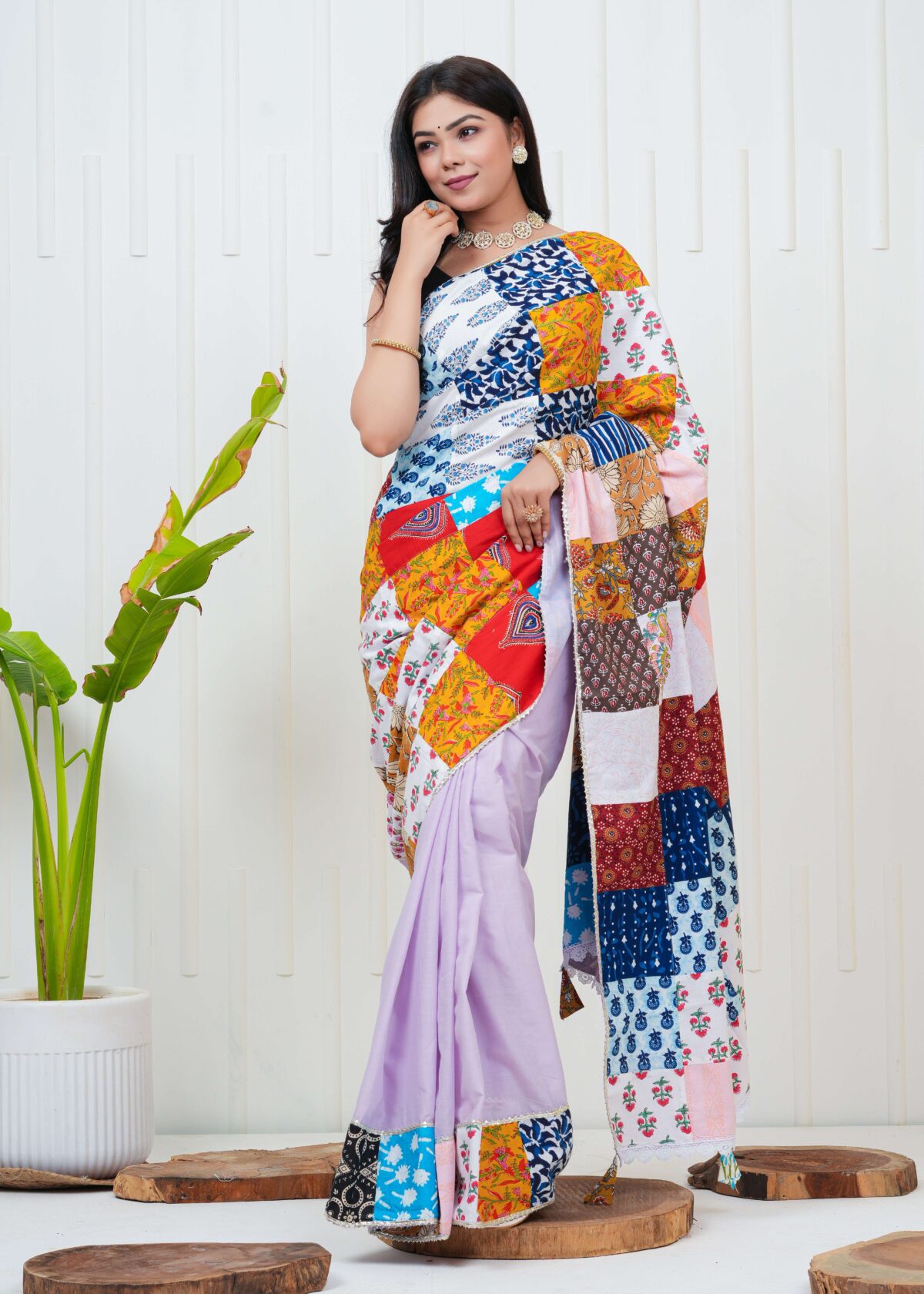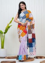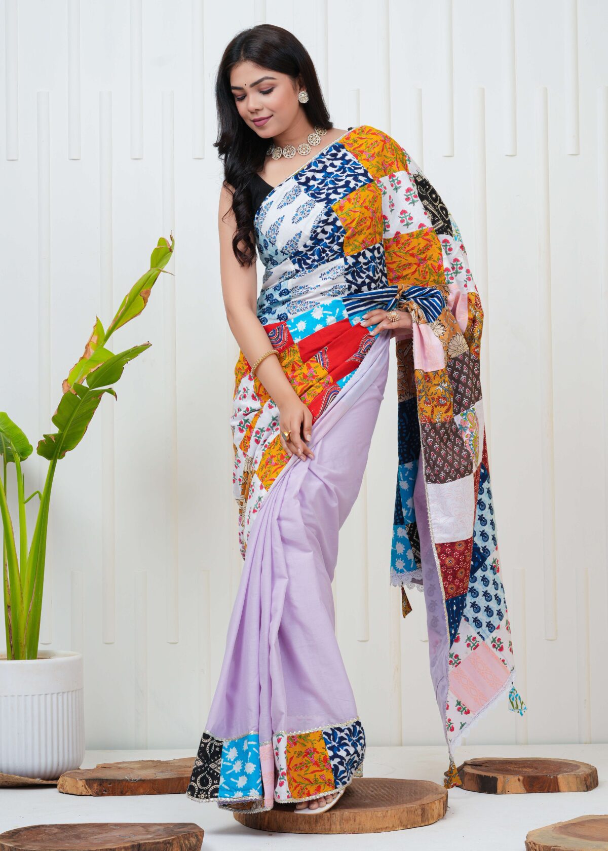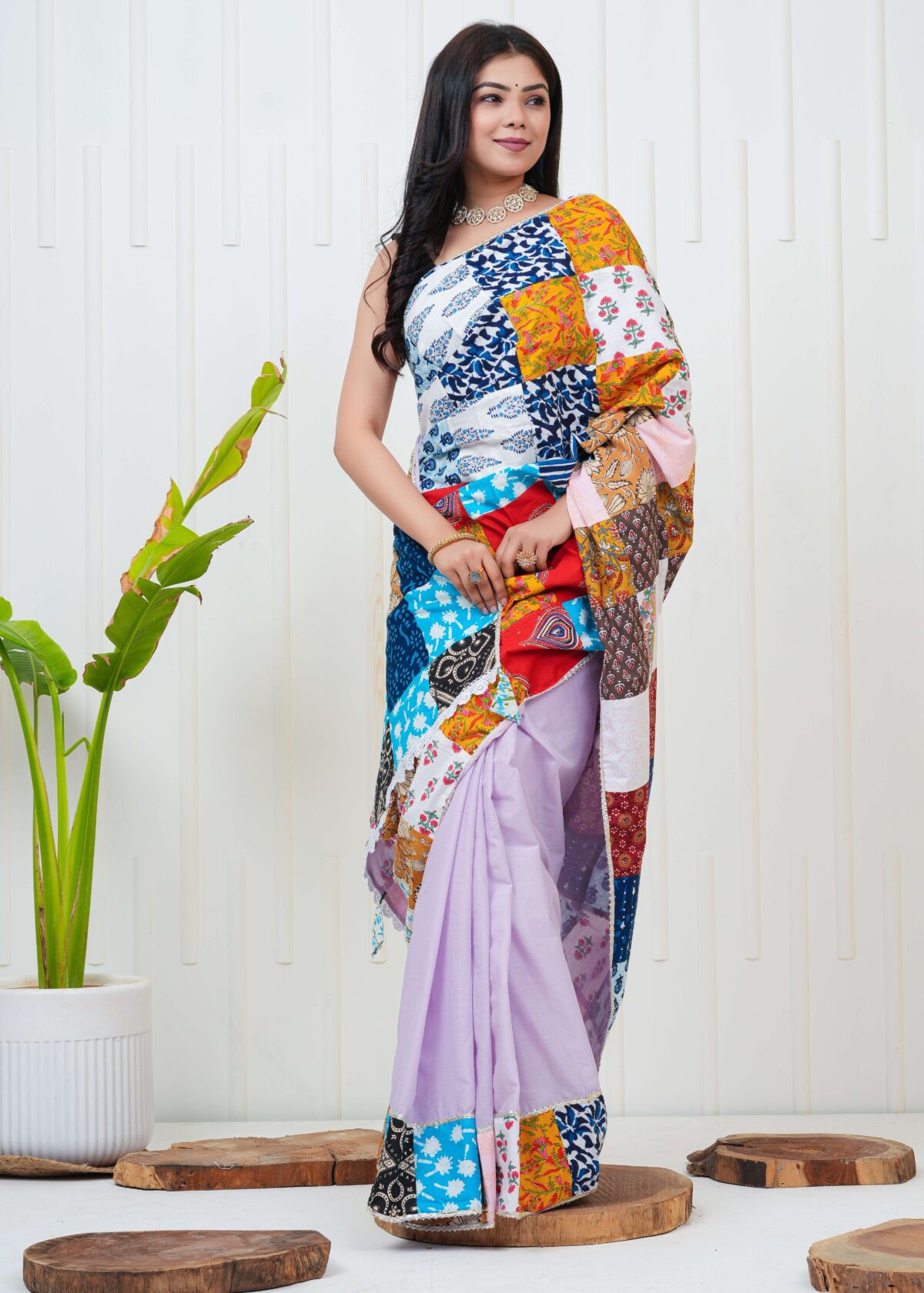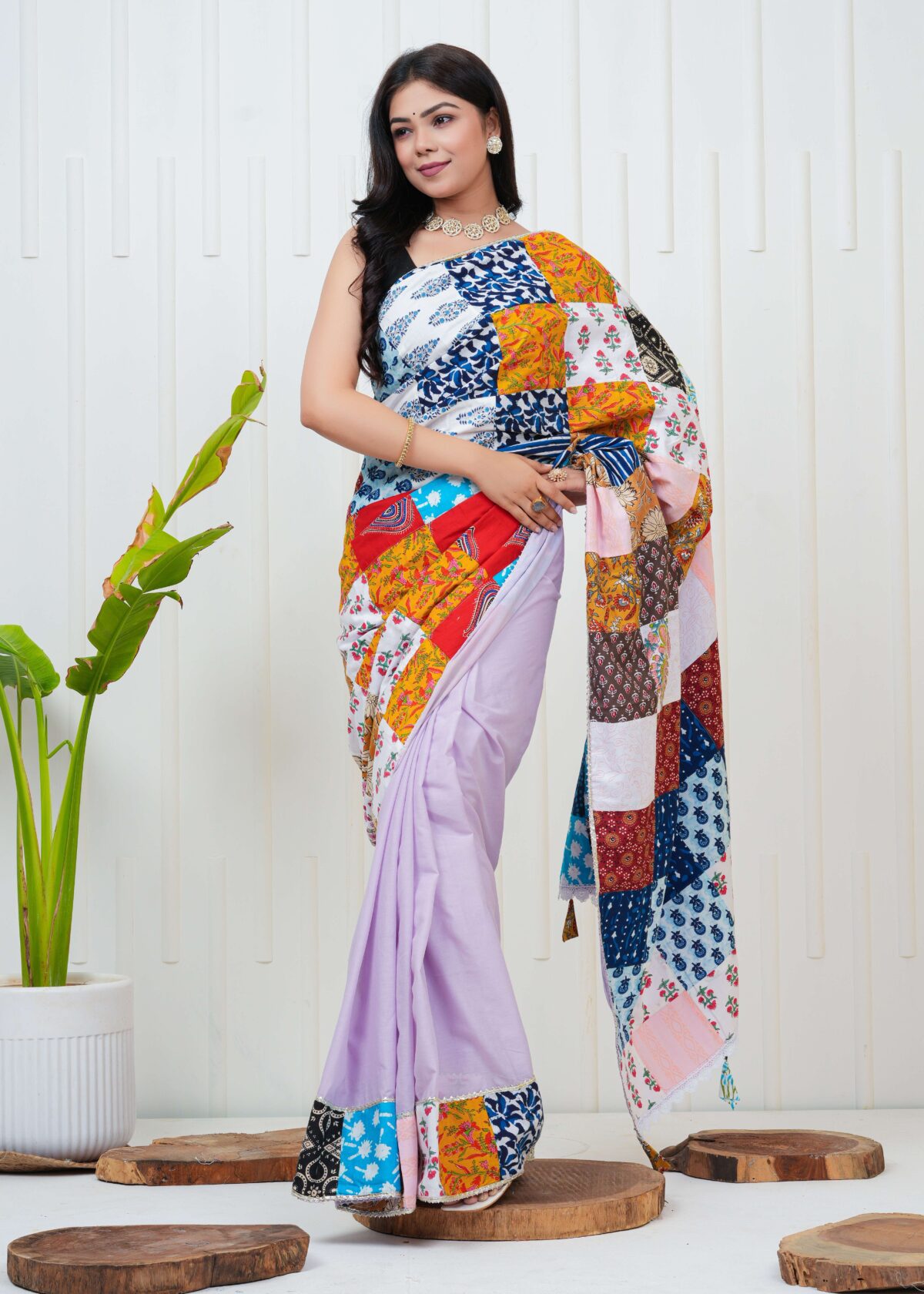 Women’s Multicolor Patchwork Printed Saree with Light Purple Base Blouse Piece Stylish Ethnic Wear