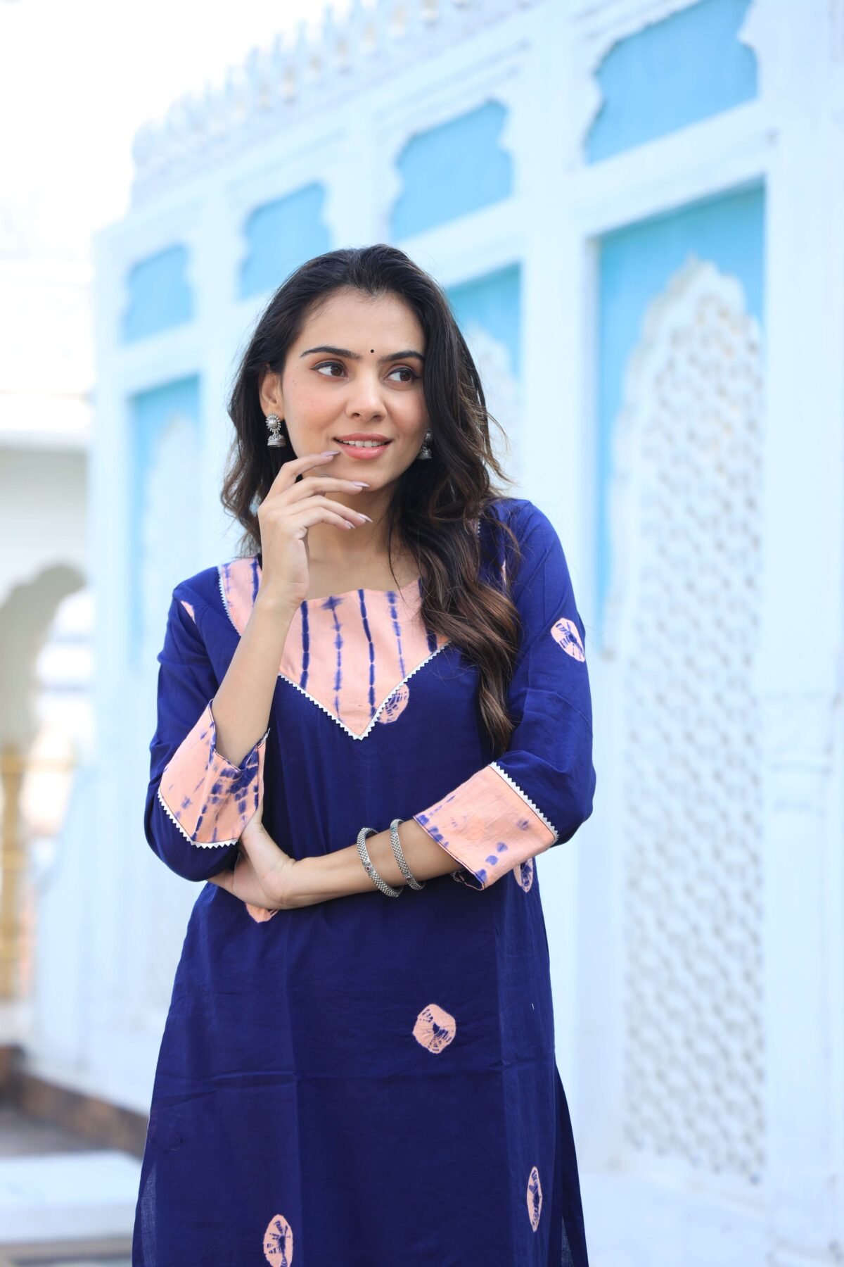 navy blue cotton kurta and pant set. Crafted from soft, breathable cotton, this kurta features delicate peach-hued printed motifs along with contrast detailing on the neckline and sleeves, giving it a refreshing and chic appeal. The straight-cut design ensures comfort and a flattering fit, making it a versatile pick for every occasion. The matching straight-fit pants complete the look, making it an effortlessly stylish outfit for office wear, festive gatherings, casual meetups, or everyday elegance.