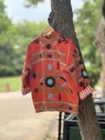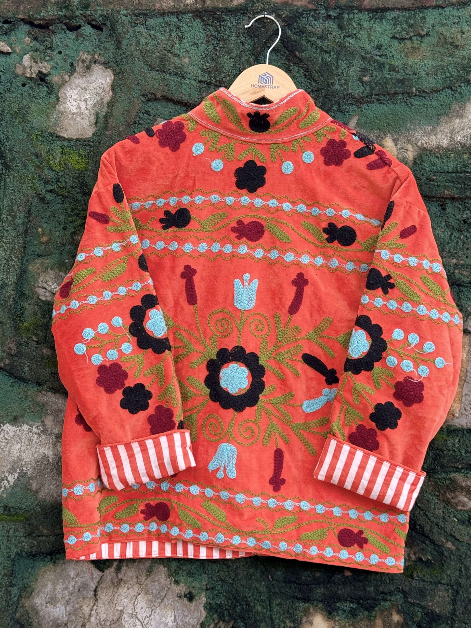 Womens Orange Velvet Embroidered Jacket with Floral Design