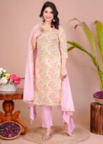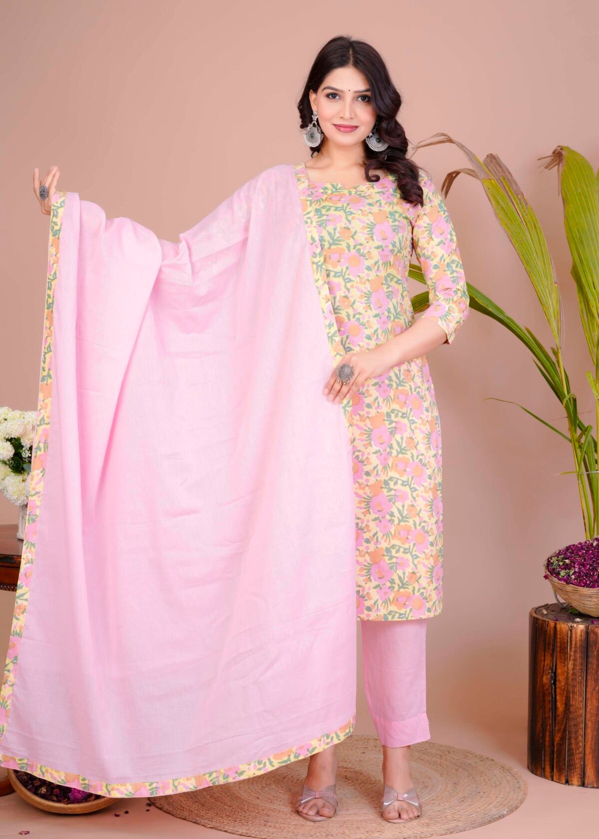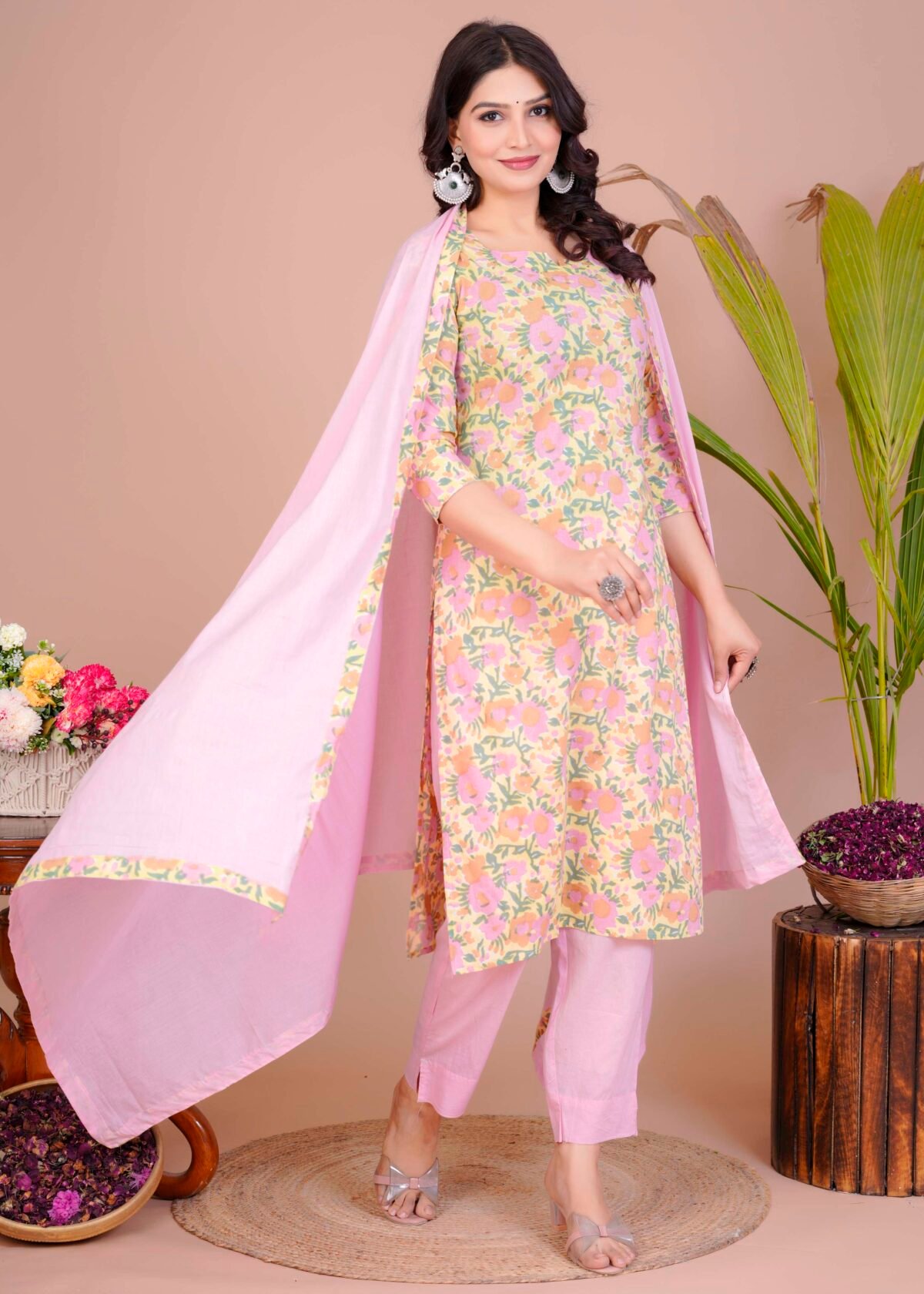Women’s Pink Cotton Printed Straight Kurti with Pant & Dupatta Set
