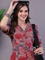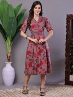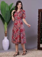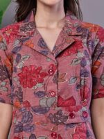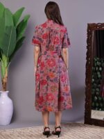 Women’s Pink Floral Cotton Pleated Midi Dress with Collar