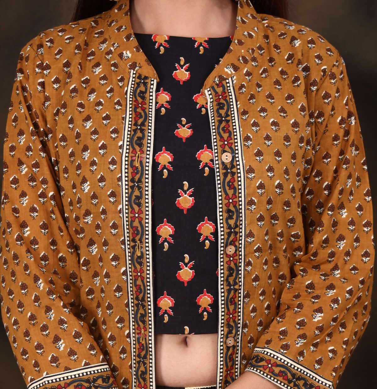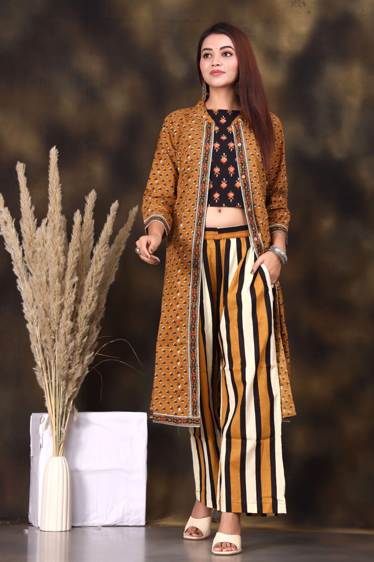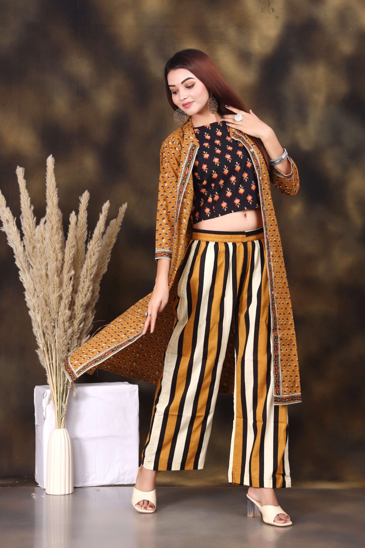 Elevate your ethnic wardrobe with this stunning handcrafted cotton shrug dress set featuring a stylish crop top, comfortable palazzo pants, and a beautifully designed shrug. Adorned with traditional block prints and intricate detailing, this ensemble perfectly blends contemporary charm with timeless elegance. Ideal for festive occasions, casual outings, or cultural celebrations, this outfit ensures comfort and sophistication in every wear.