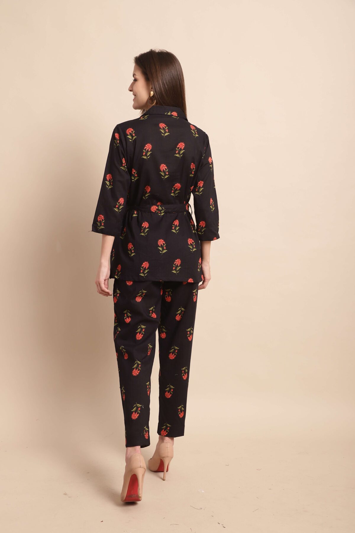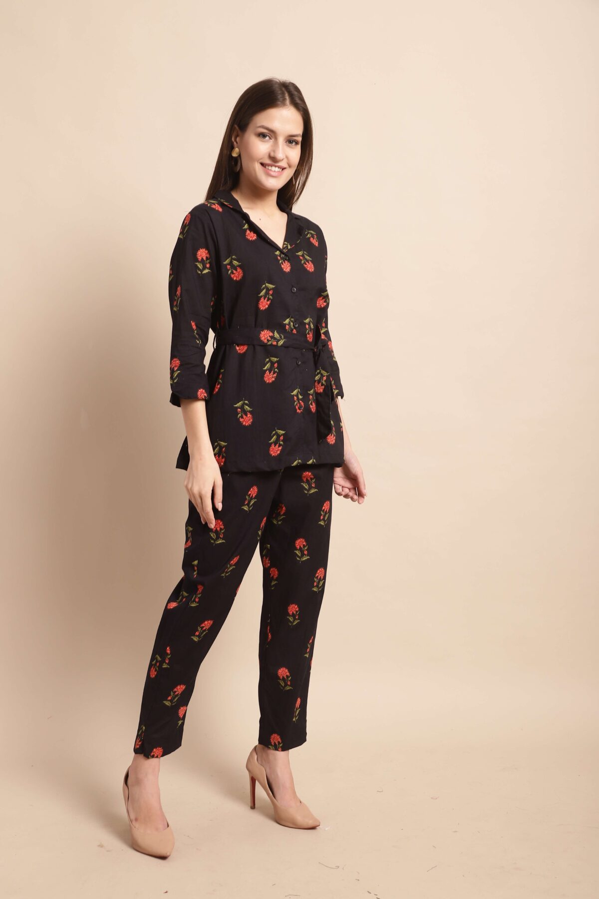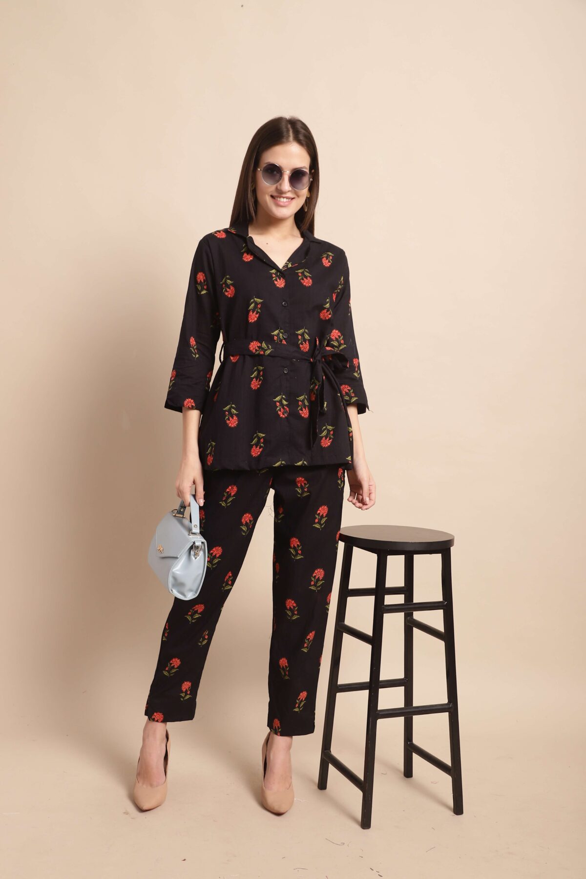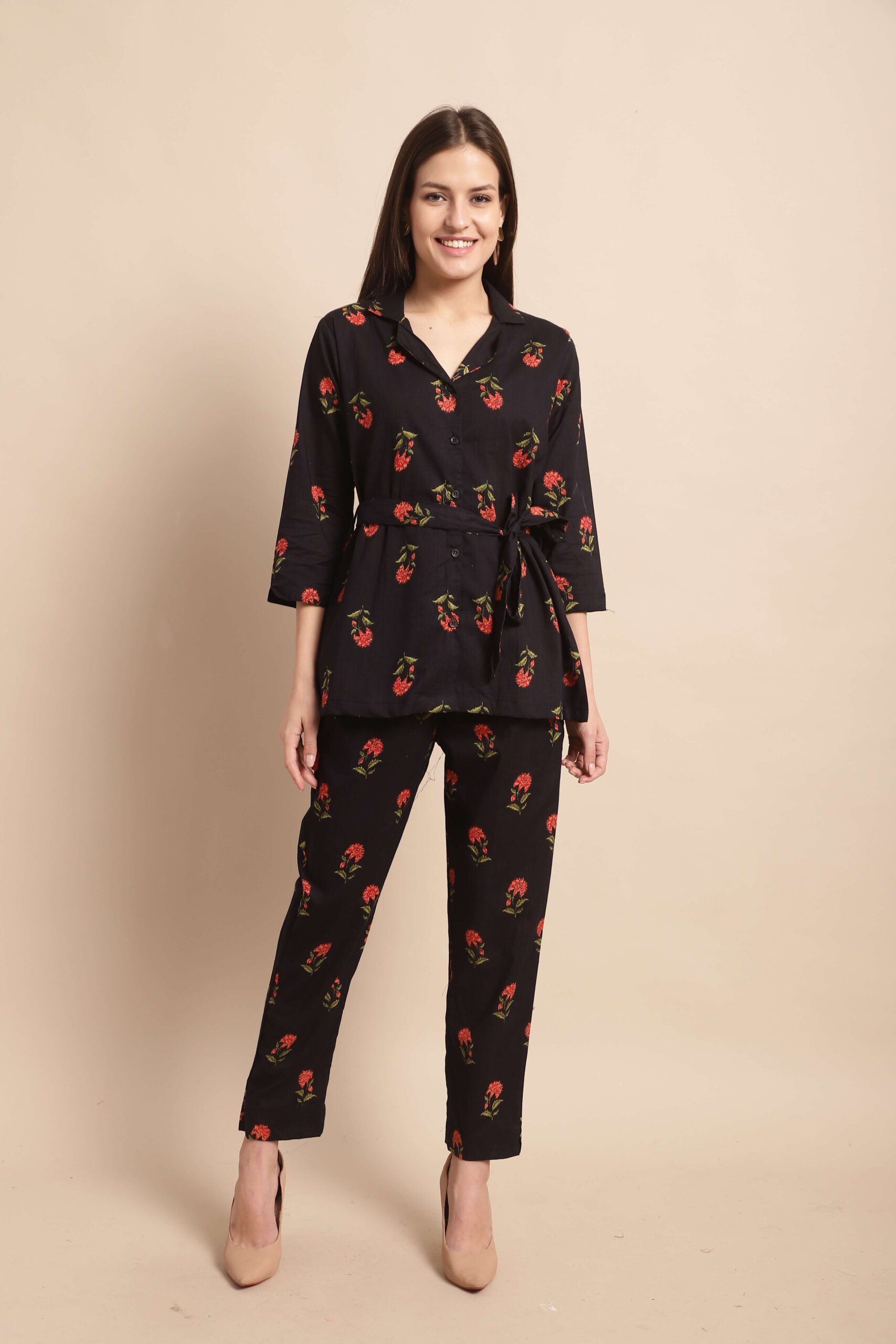 Women’s Pure Cotton Printed Collared Top and Pant Co-ord Set (Black Rd)