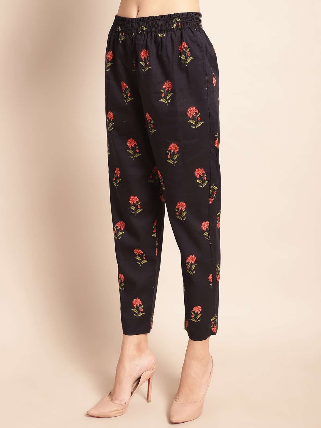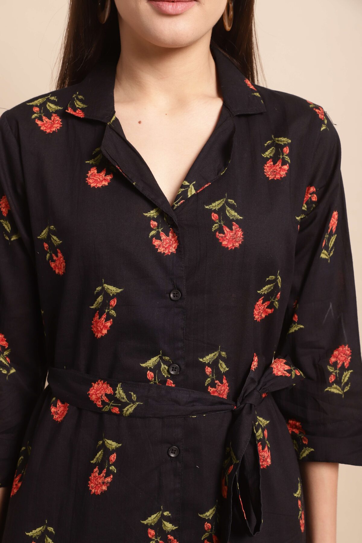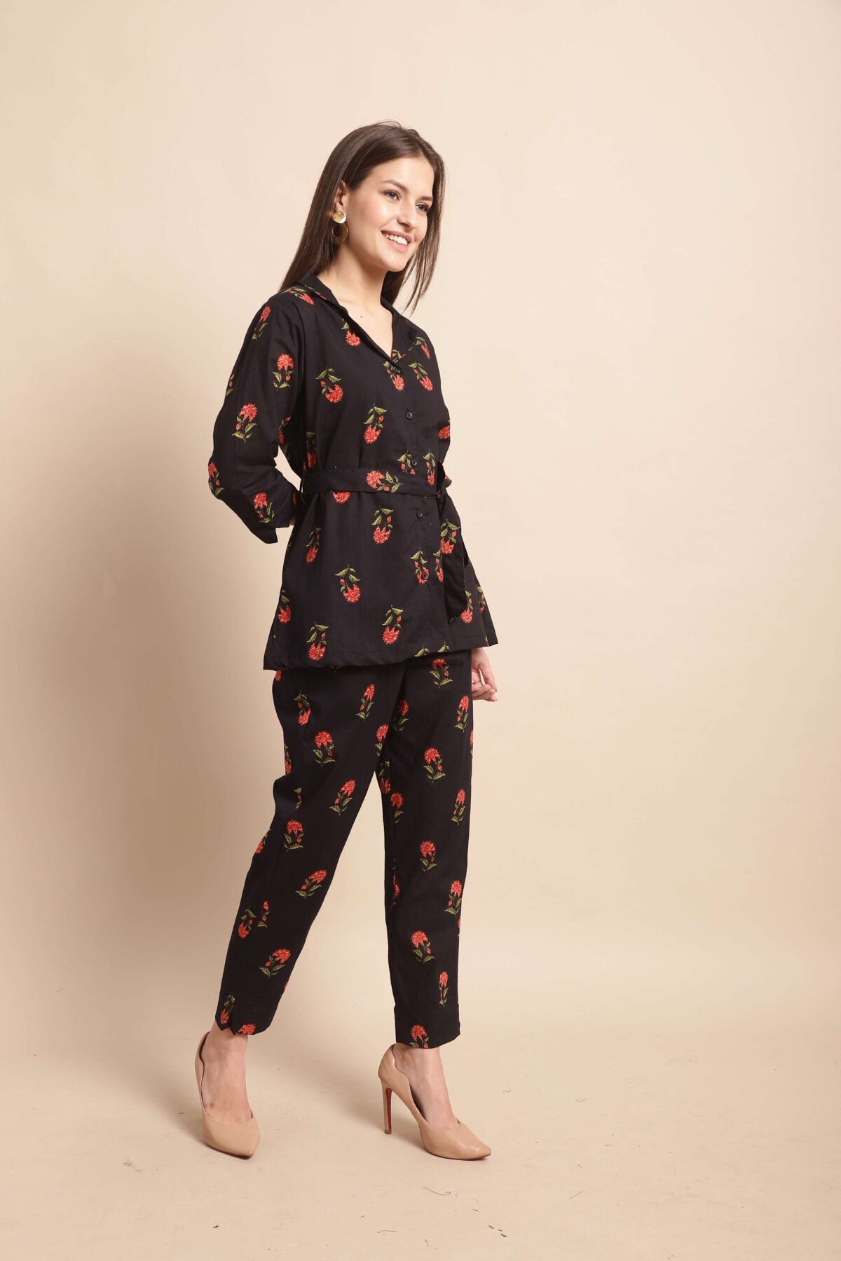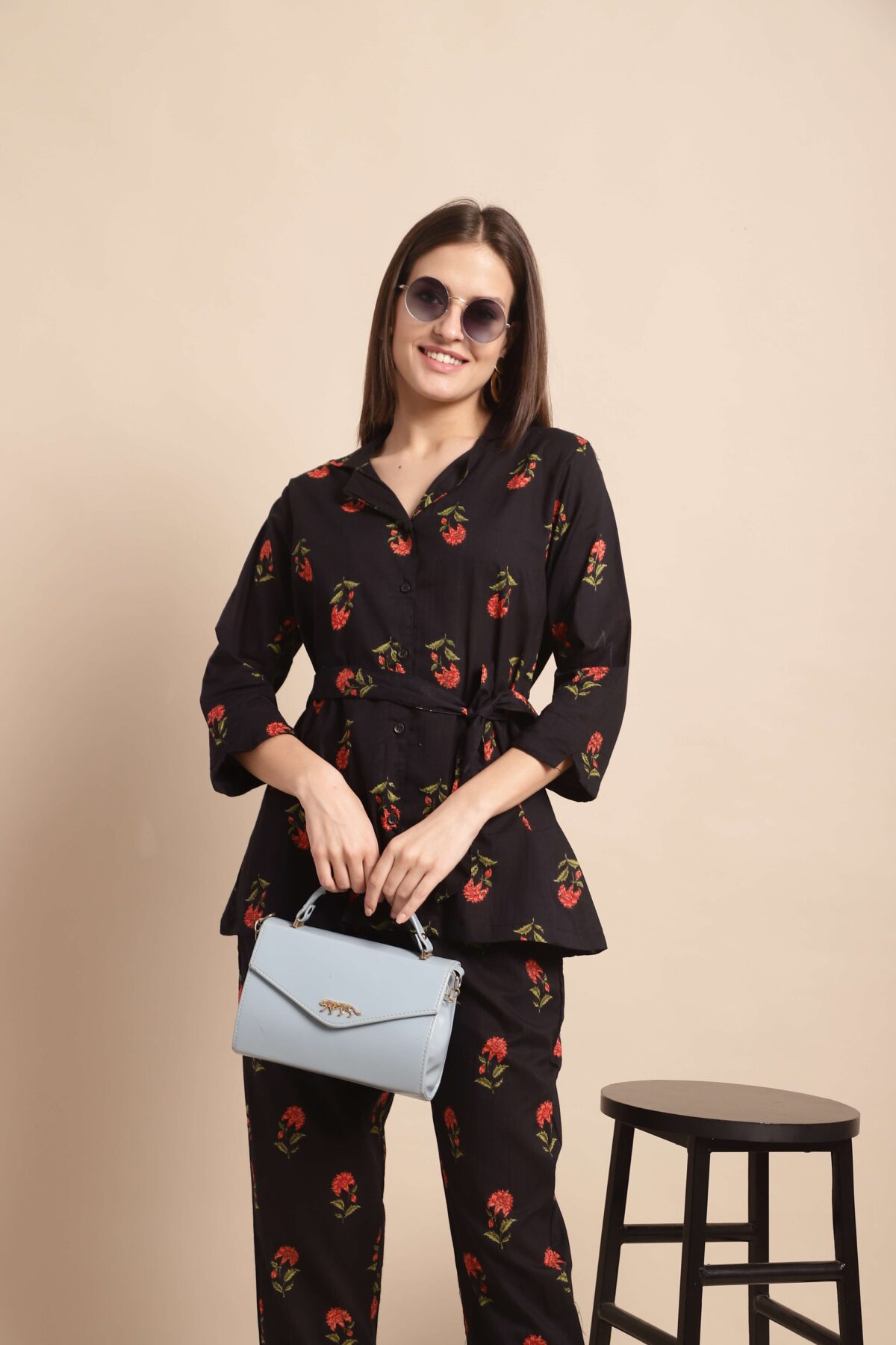 Women’s Pure Cotton Printed Collared Top and Pant Co-ord Set (Black Rd)
