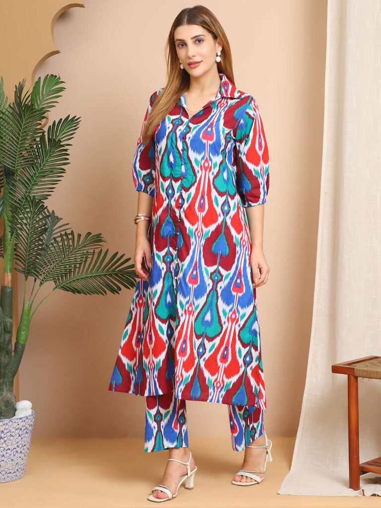 Women’s Pure Cotton Printed Co-ord Set, featuring a smart collared top and matching pants. Crafted from soft, breathable cotton with trendy prints, this coordinated outfit blends comfort with style ? perfect for casual outings, travel, or laid-back weekends. The collared design adds a touch of structure, making it ideal for both lounge and on-the-go looks.