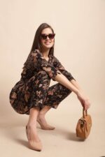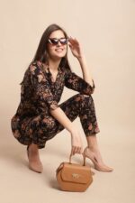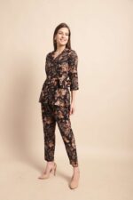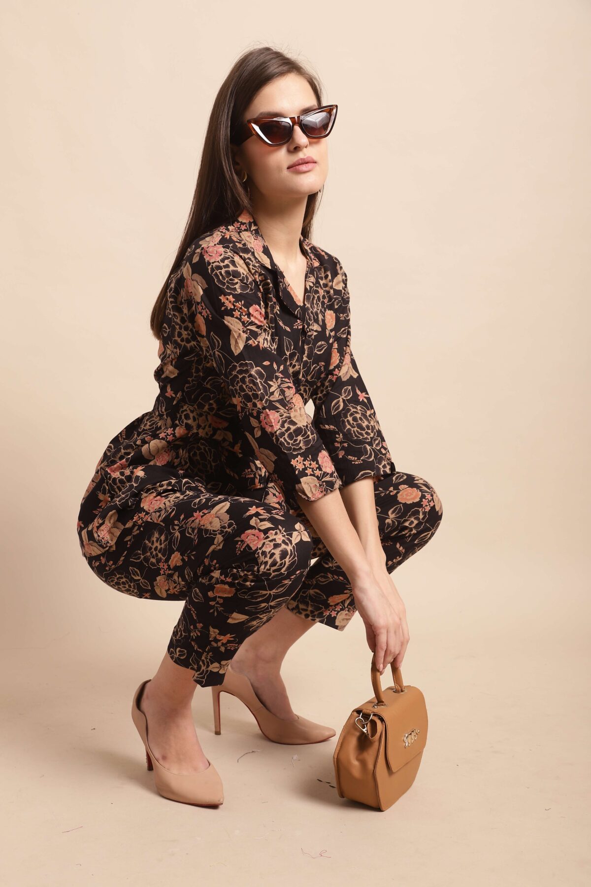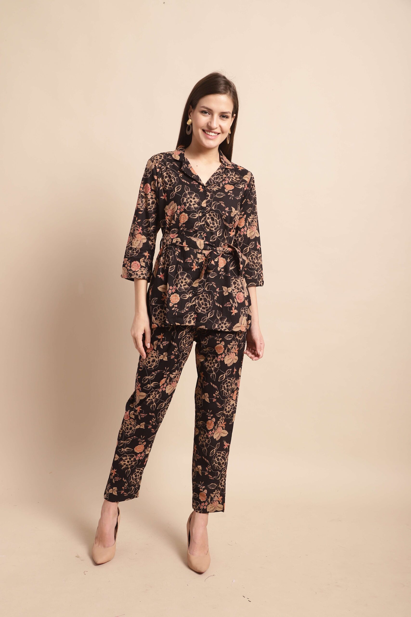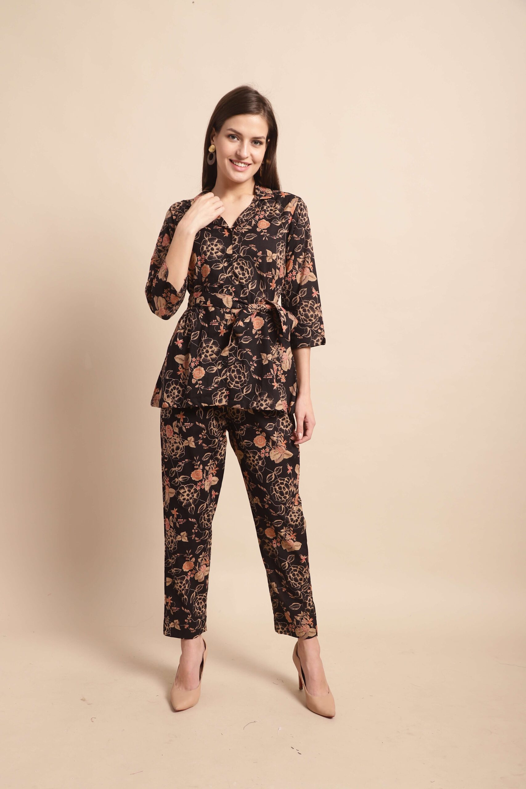 Women’s Pure Cotton Printed Collared Top and Pant Co-ord Set (Black)