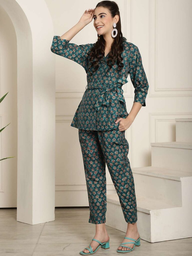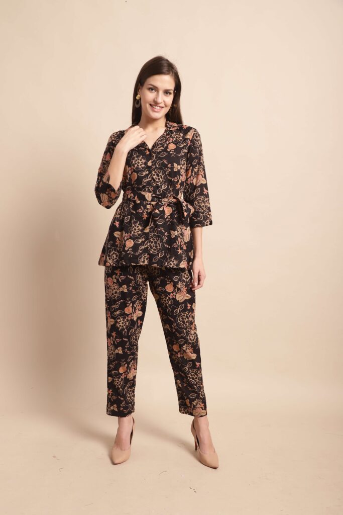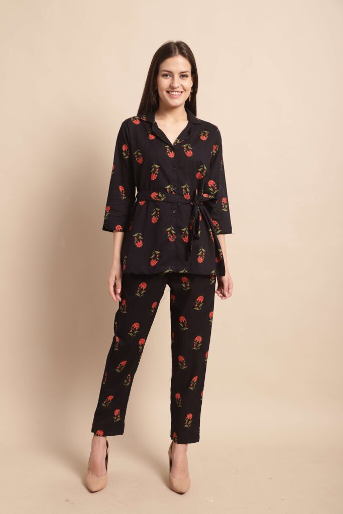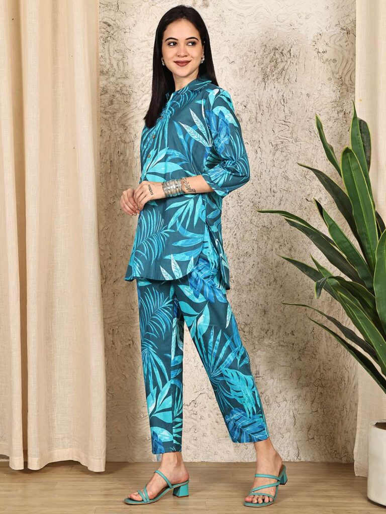 Women’s Pure Cotton Printed Co-ord Set, featuring a smart collared top and matching pants. Crafted from soft, breathable cotton with trendy prints, this coordinated outfit blends comfort with style ? perfect for casual outings, travel, or laid-back weekends. The collared design adds a touch of structure, making it ideal for both lounge and on-the-go looks.