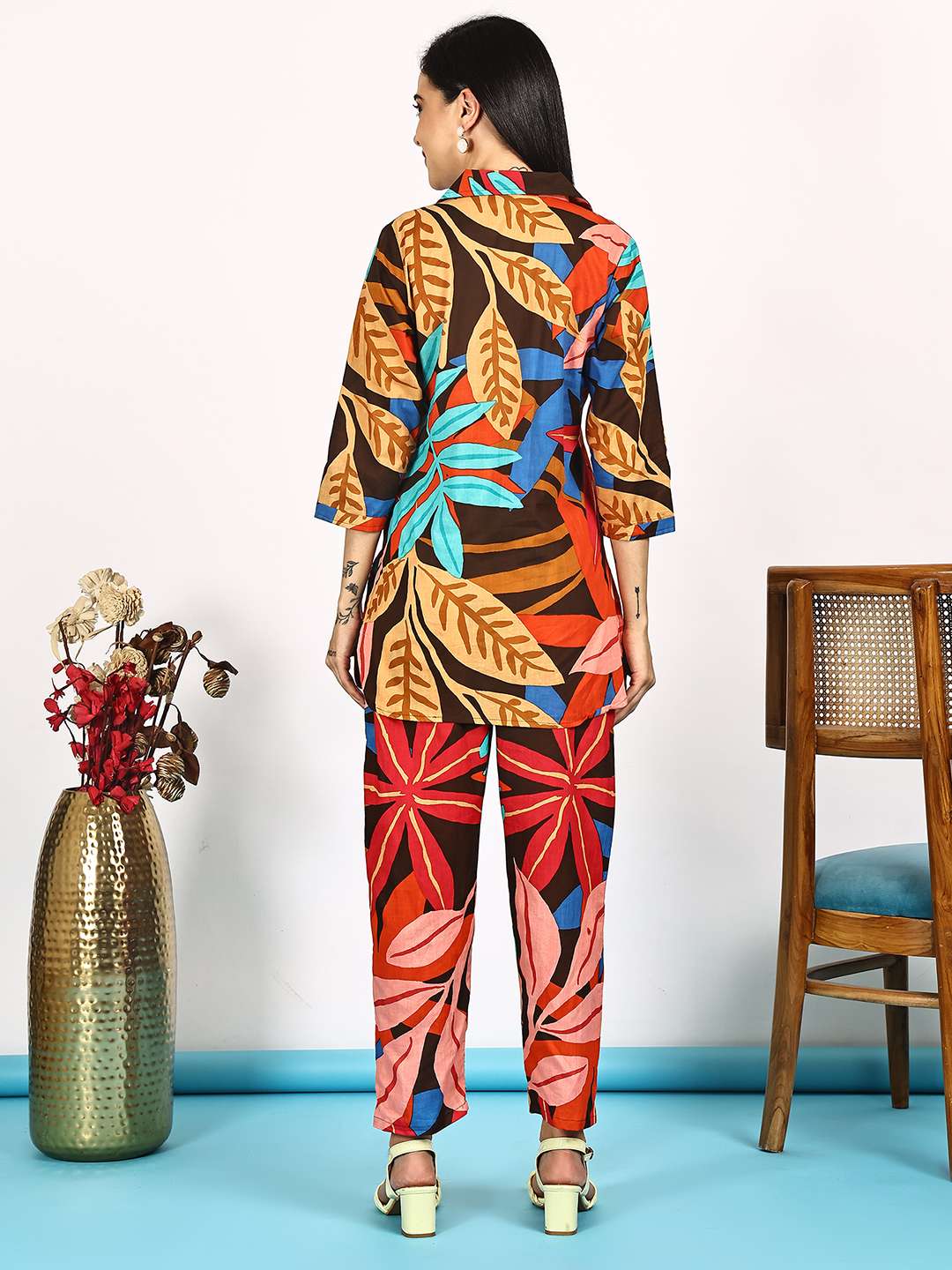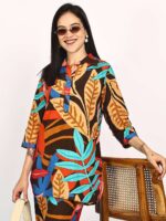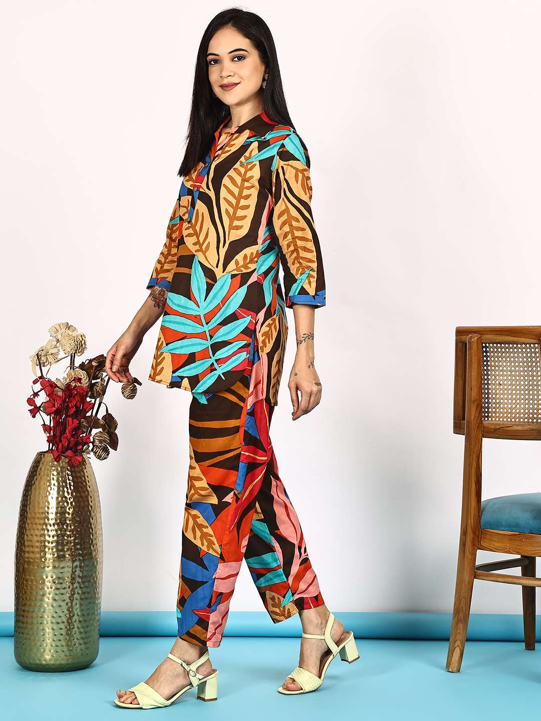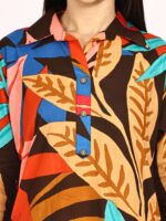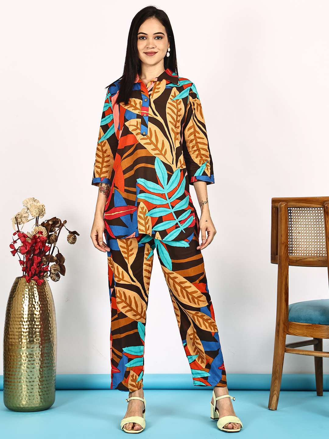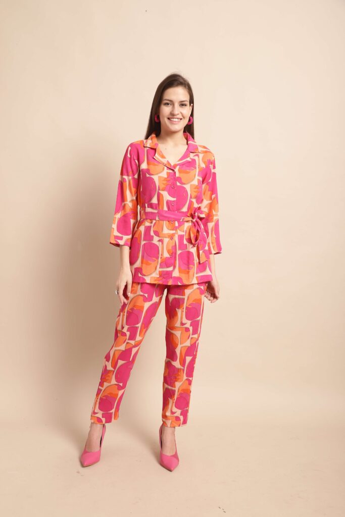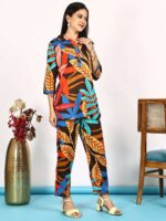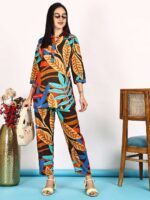 Women’s Pure Cotton Printed Collared Top and Pant Co-ord Set (Multti Color1)