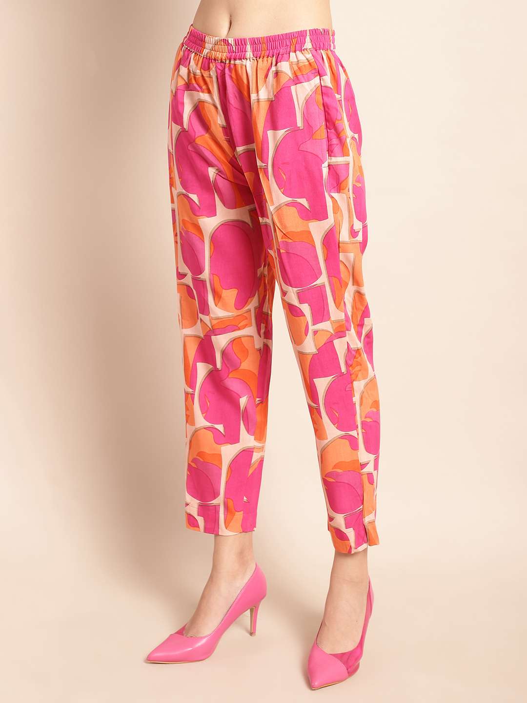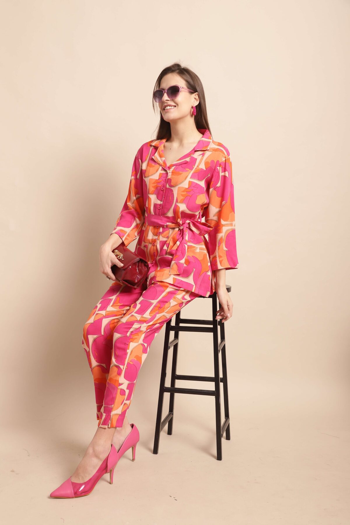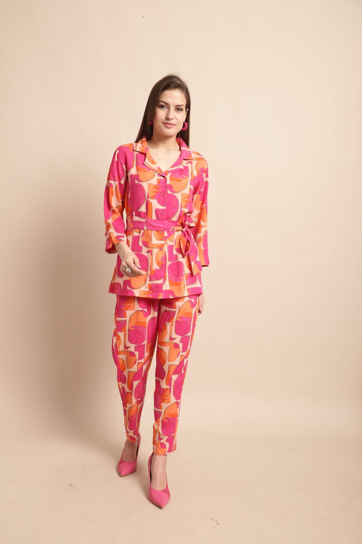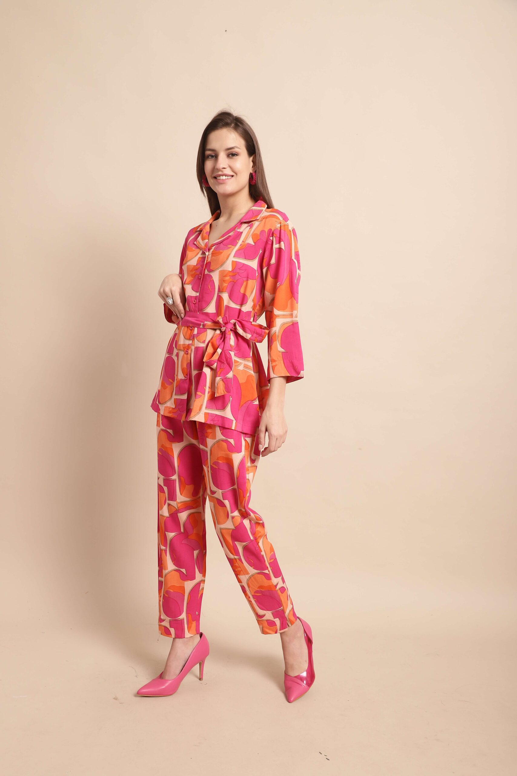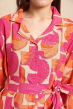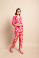 Women’s Pure Cotton Printed Collared Top and Pant Co-ord Set (Pink)