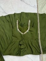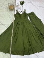 Elegance with this beautifully crafted 3 Piece Anarkali Set featuring a fully flared gown, matching pant, and dupatta. Designed in premium Pure Romansilk Chanderi fabric, this outfit combines royal charm with modern comfort, making it a perfect choice for weddings, festive celebrations, and special occasions. The intricate lace work on the yoke, paired with a graceful dupatta adorned with fancy mirror lace, adds a touch of sophistication to your ethnic look. With its flattering silhouette and comfortable fit, this ready-to-wear ensemble ensures you look stunning and feel confident throughout the day.