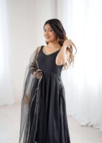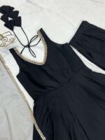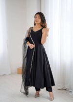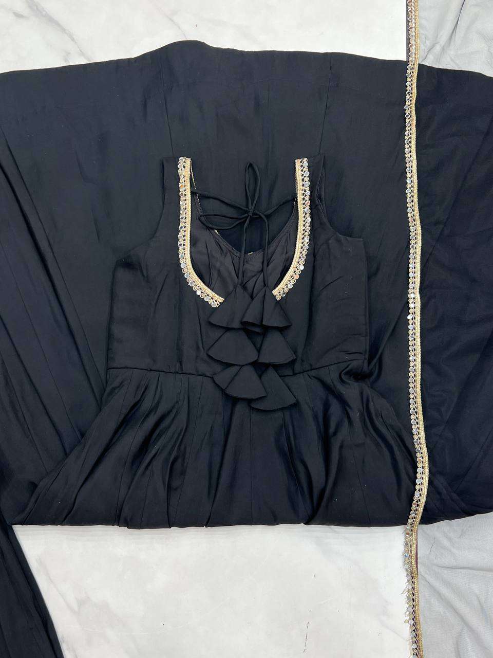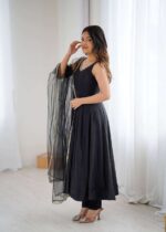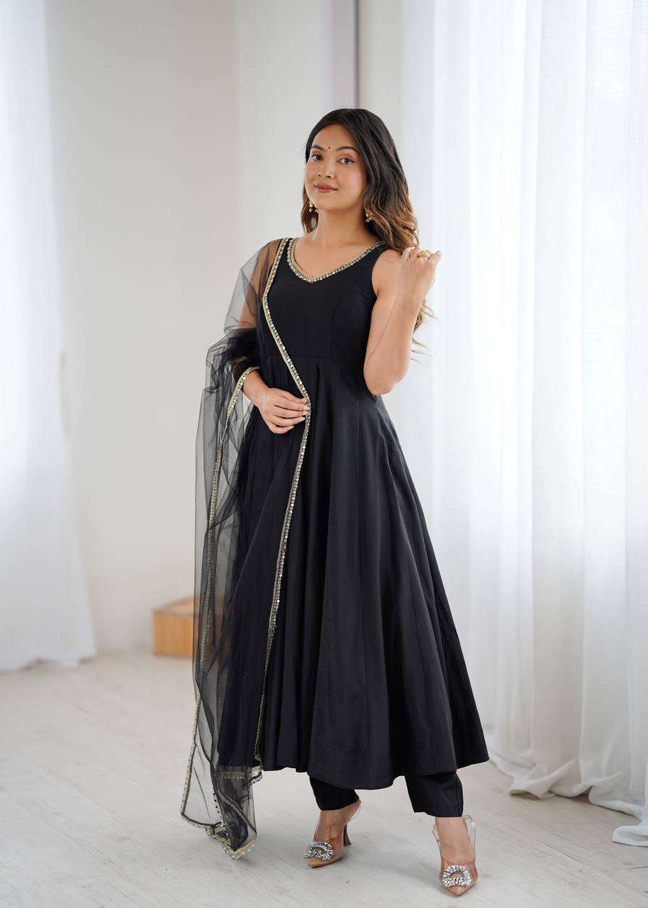 Elegance with this beautifully crafted 3 Piece Anarkali Set featuring a fully flared gown, matching pant, and dupatta. Designed in premium Pure Romansilk Chanderi fabric, this outfit combines royal charm with modern comfort, making it a perfect choice for weddings, festive celebrations, and special occasions. The intricate lace work on the yoke, paired with a graceful dupatta adorned with fancy mirror lace, adds a touch of sophistication to your ethnic look. With its flattering silhouette and comfortable fit, this ready-to-wear ensemble ensures you look stunning and feel confident throughout the day.
