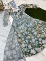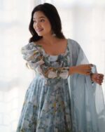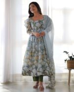 Womens Pure Romansilk Chanderi Floral Printed Anarkali Kurti With Dupatta & Pant Set