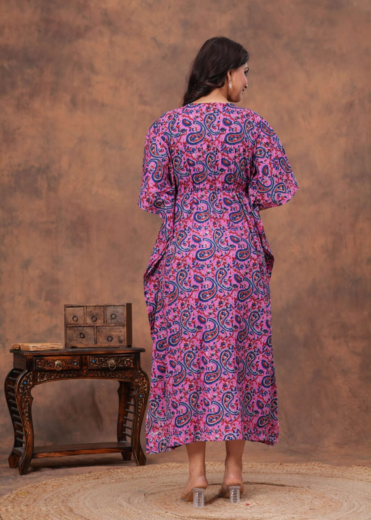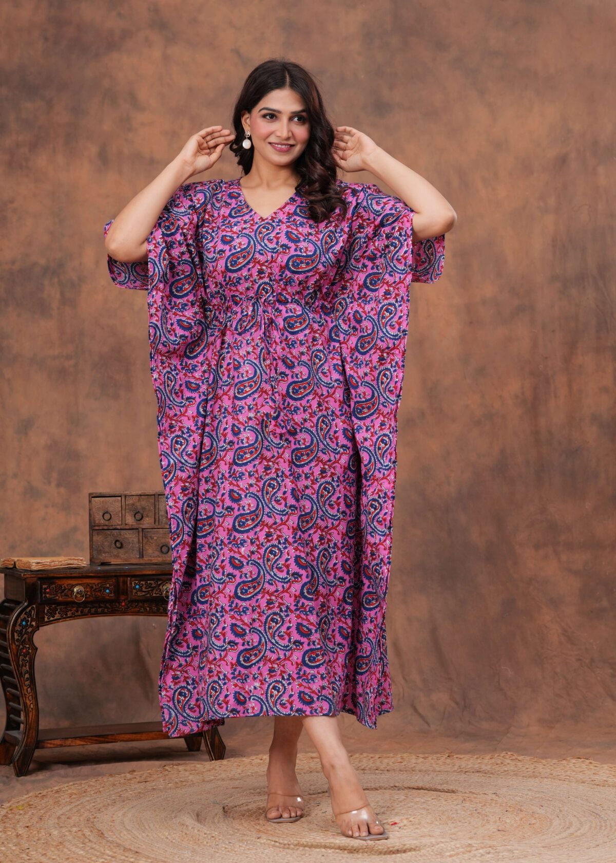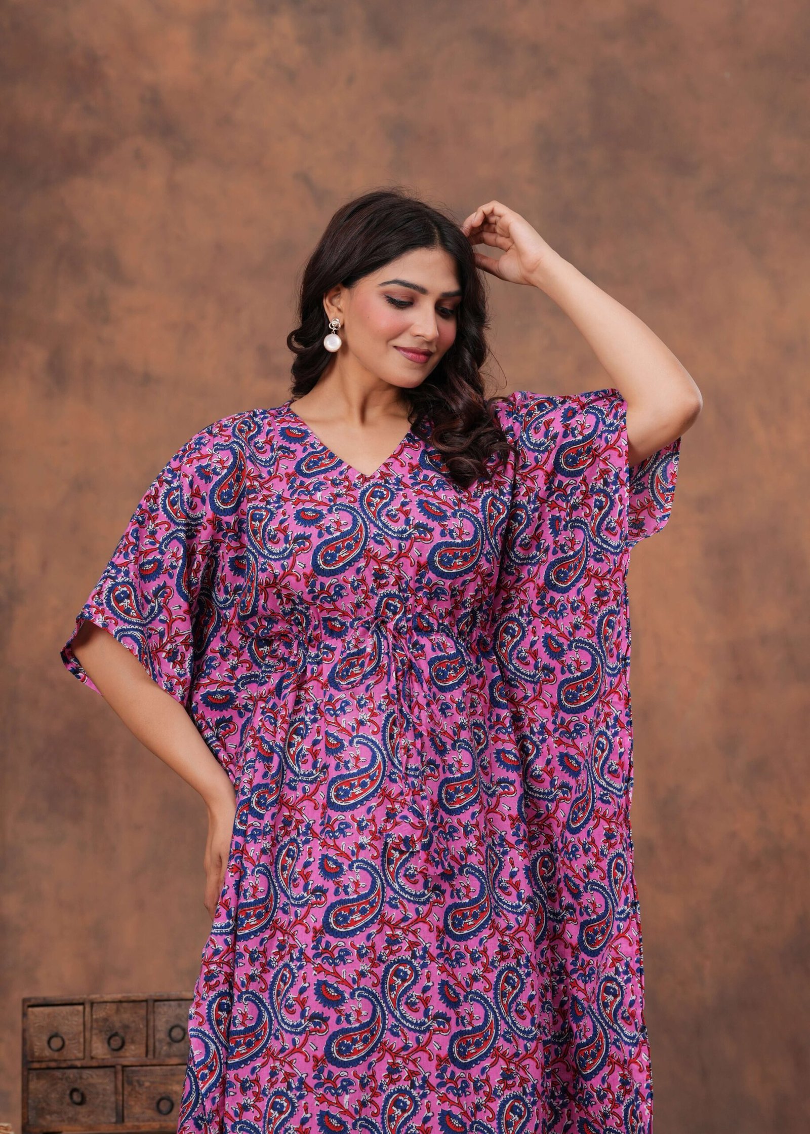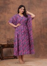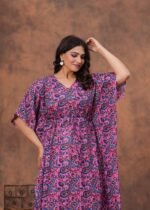 Elevate your everyday style with this beautifully crafted cotton kaftan dress. Designed for comfort and elegance, it features a soft breathable fabric that feels gentle on the skin, making it perfect for all-day wear. The relaxed fit is enhanced with a drawstring waist, allowing you to adjust the silhouette for a flattering look. With its stylish print and flowing design, this kaftan is ideal for lounging at home, casual outings, or vacation wear.