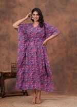 Women’s Purple Blue Cotton Floral Printed Kaftan Dress with Drawstring Waist