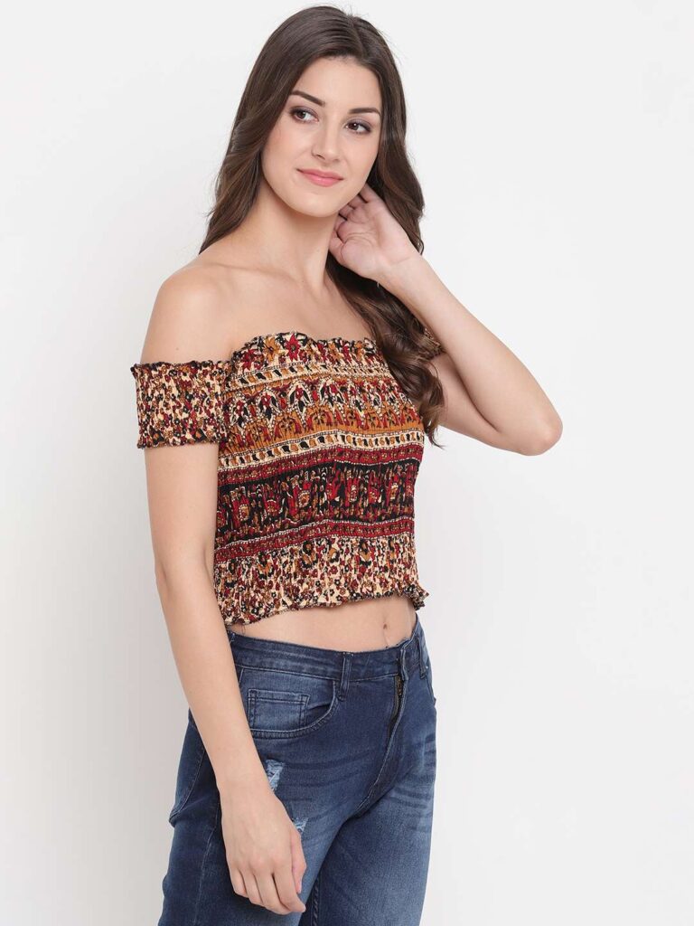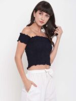 Women’s Rayon Solid Off-Shoulder Smocked Crop Top Short Sleeve Casual Styles Tank Top (FREE SIZE) Multi20