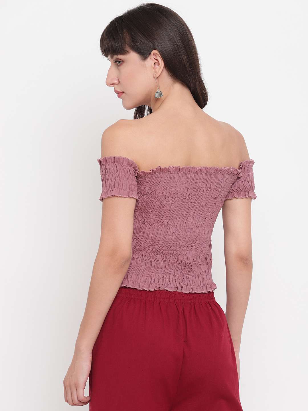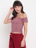 Women’s Rayon Solid Off-Shoulder Smocked Crop Top Short Sleeve Casual Styles Tank Top (FREE SIZE) Multi29