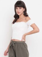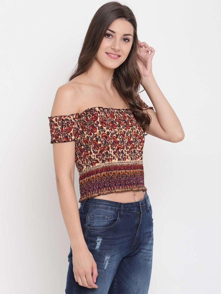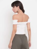 Make a bold statement with this stunning off-shoulder crop top. The smocked fabric creates an elegant textured pattern with delicate detailing throughout. Its stretchy, shirred design ensures a comfortable and flattering fit while the ruffled trim adds a feminine touch. The off-shoulder neckline with short sleeves creates a romantic silhouette perfect for casual outings or dressy occasions. The cropped length pairs beautifully with high-waisted jeans, skirts, or shorts. The vibrant colour makes it an eye-catching piece for your wardrobe. The elasticated top and bottom hems provide secure wearing comfort. This versatile top can be dressed up or down depending on the occasion, making it a must-have fashion staple for the modern wardrobe. The lightweight fabric makes it ideal for warm weather, while the fitted silhouette flatters various body types.
