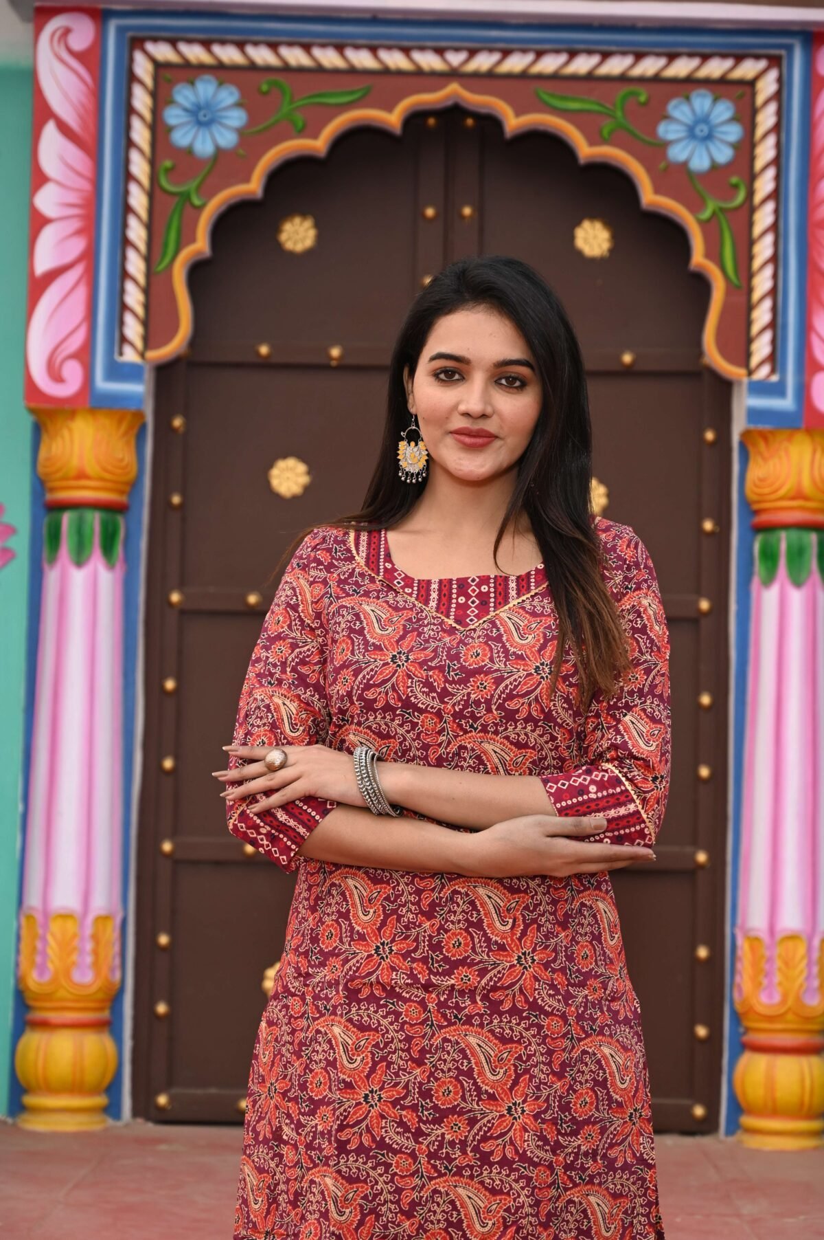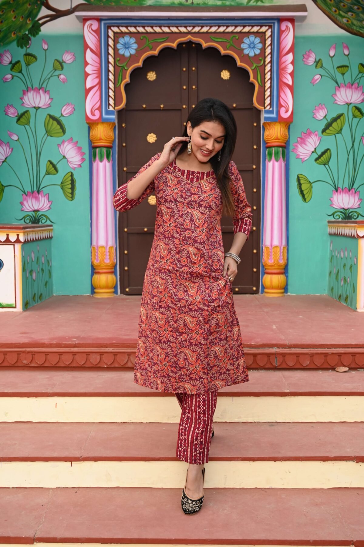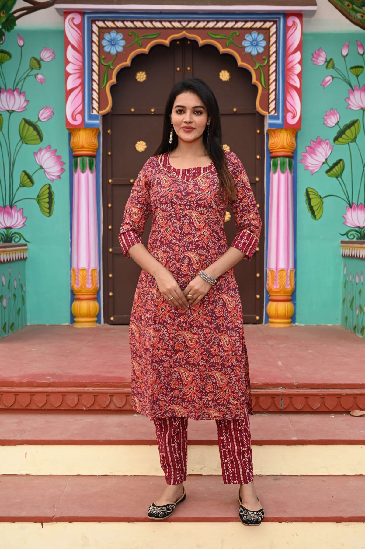 Red printed cotton kurta set, crafted for women who love a balance of tradition and modern style. The kurta features all-over white handblock-inspired circular motifs, paired with a contrast striped yoke design that adds a chic touch to the outfit. Designed with a straight fit and 3/4th sleeves, this set offers effortless comfort and sophistication. The breathable cotton fabric makes it perfect for daily wear, office dressing, festive events, and semi-formal gatherings. It comes with matching printed pants, ensuring a complete coordinated look.