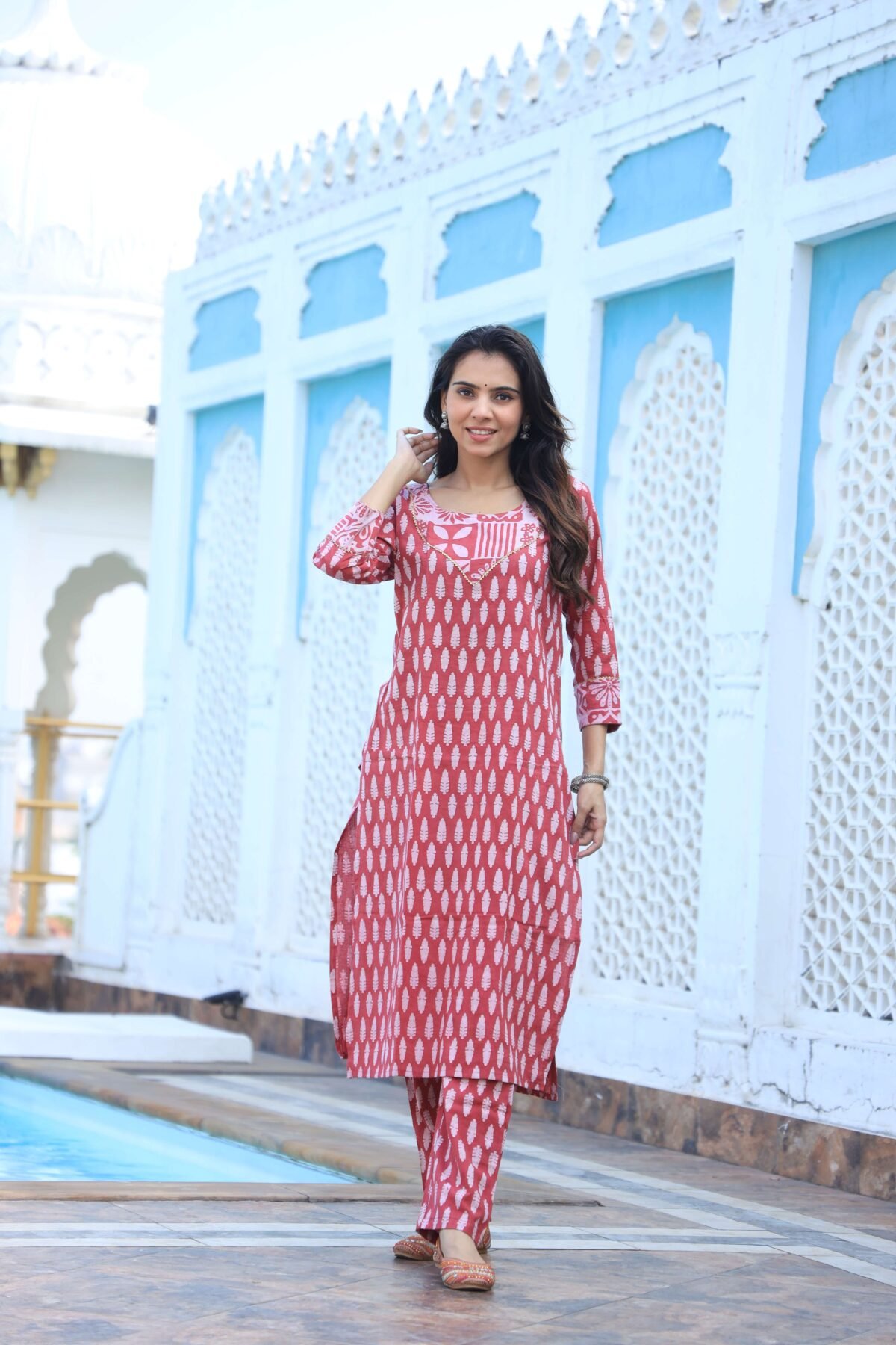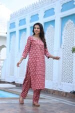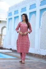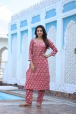 red cotton printed kurta and pant set. Designed with all-over white ethnic motifs, this kurta features a beautifully patterned neckline and contrasting sleeve cuffs that enhance its stylish appeal. The straight-cut silhouette with side slits ensures a flattering fit, while the matching printed pants complete the coordinated look. Made from soft, breathable cotton, this kurta set is an ideal choice for office wear, casual outings, family gatherings, or festive celebrations.