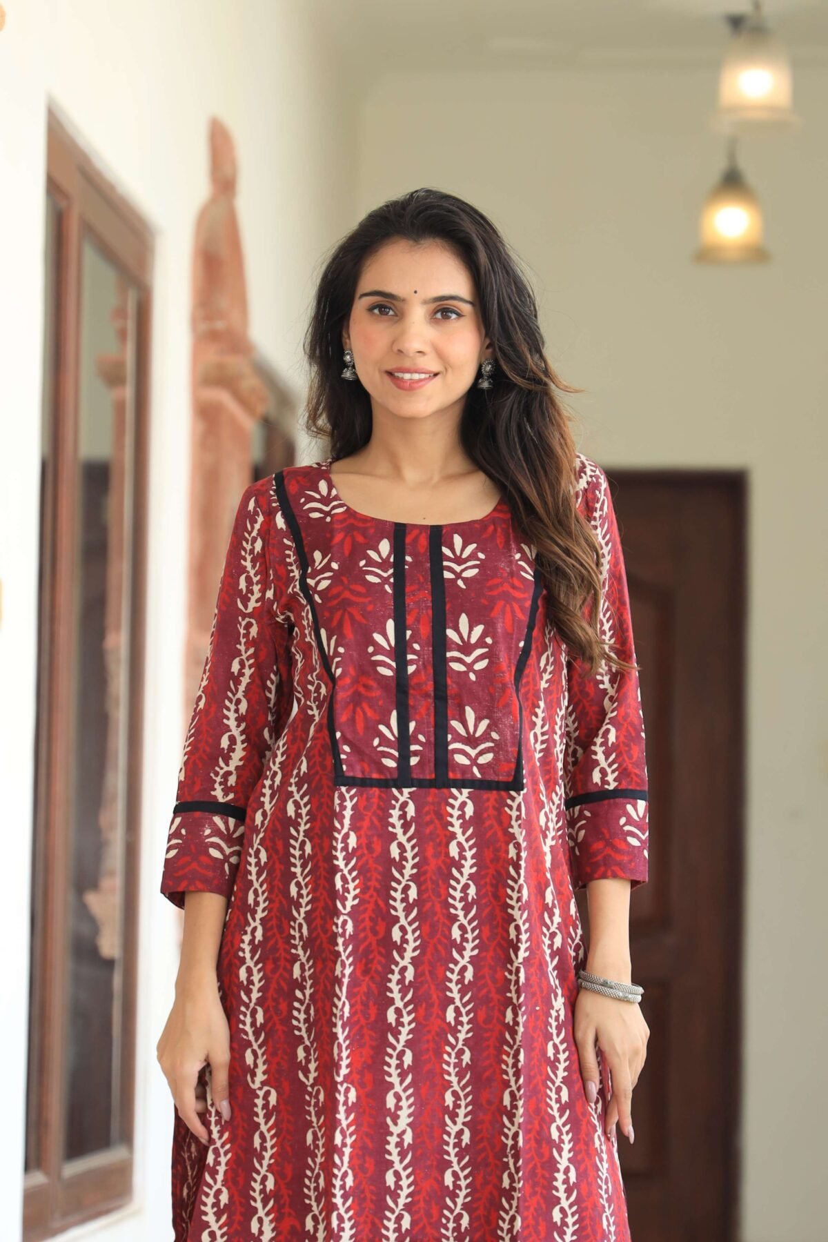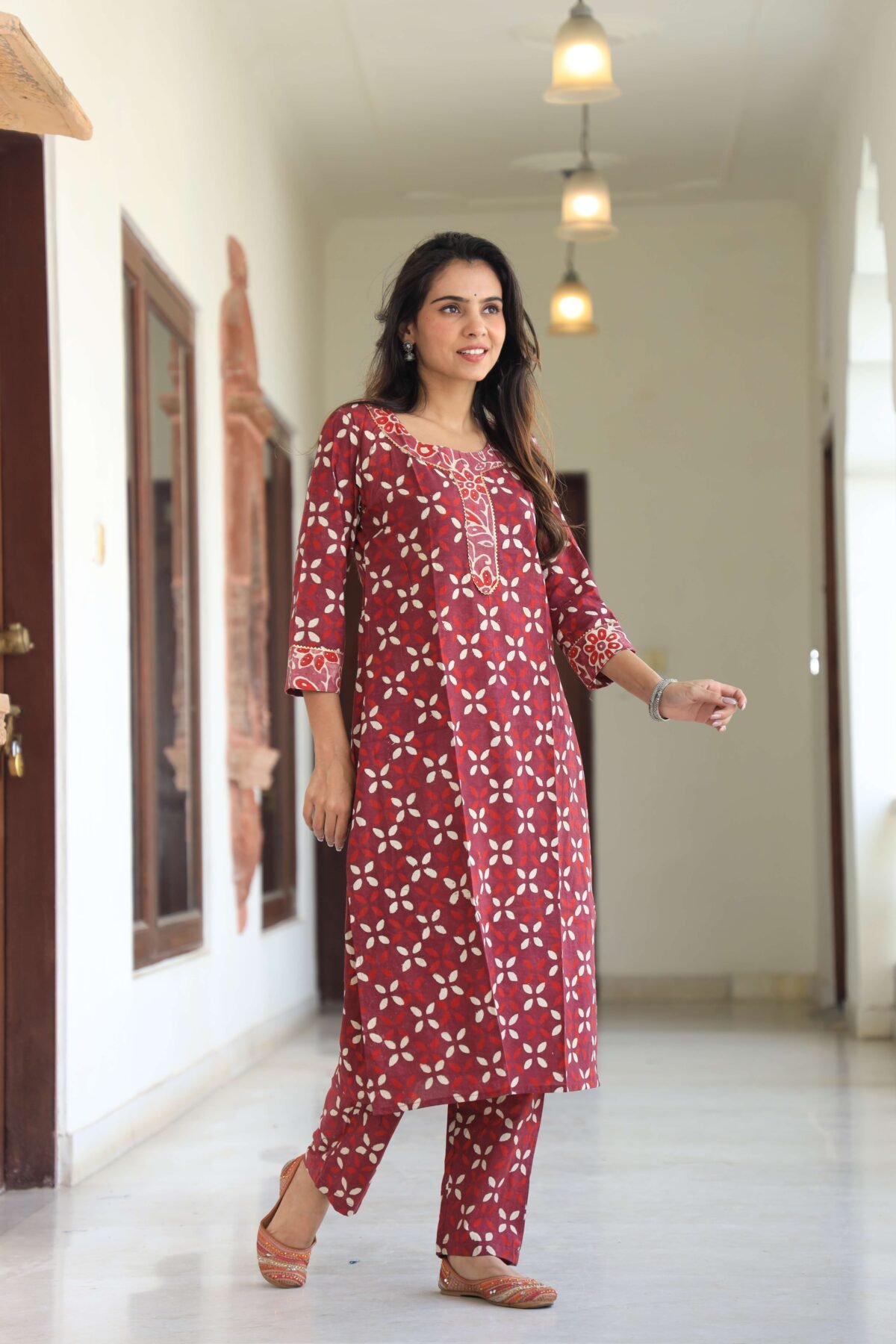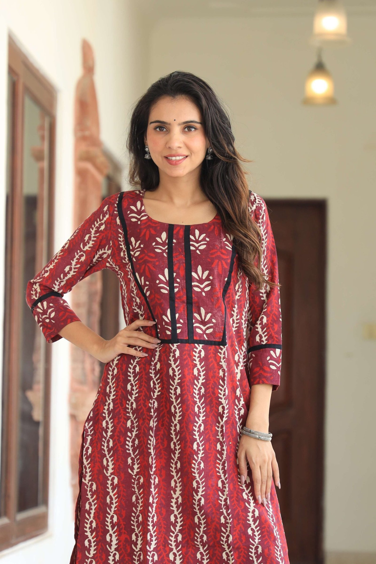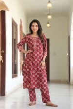 Red printed cotton kurta set, crafted for women who love a balance of tradition and modern style. The kurta features all-over white handblock-inspired circular motifs, paired with a contrast striped yoke design that adds a chic touch to the outfit. Designed with a straight fit and 3/4th sleeves, this set offers effortless comfort and sophistication. The breathable cotton fabric makes it perfect for daily wear, office dressing, festive events, and semi-formal gatherings. It comes with matching printed pants, ensuring a complete coordinated look.