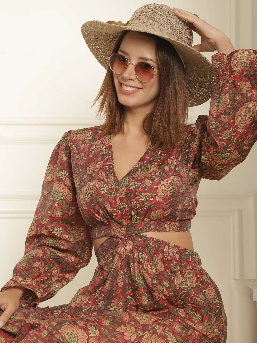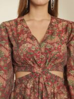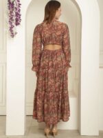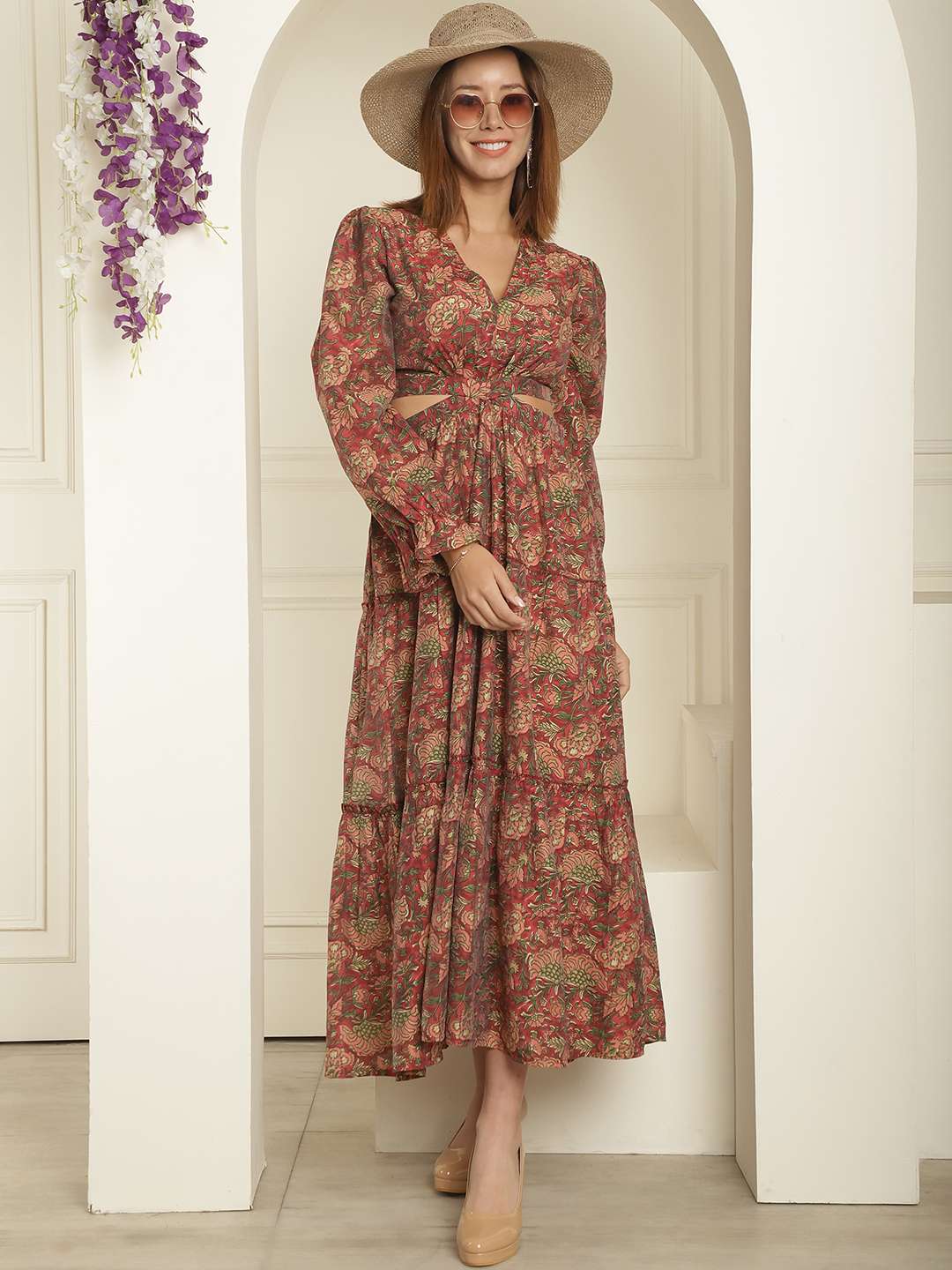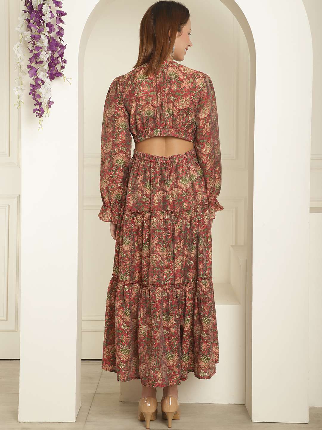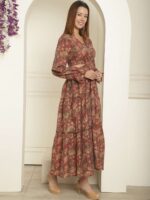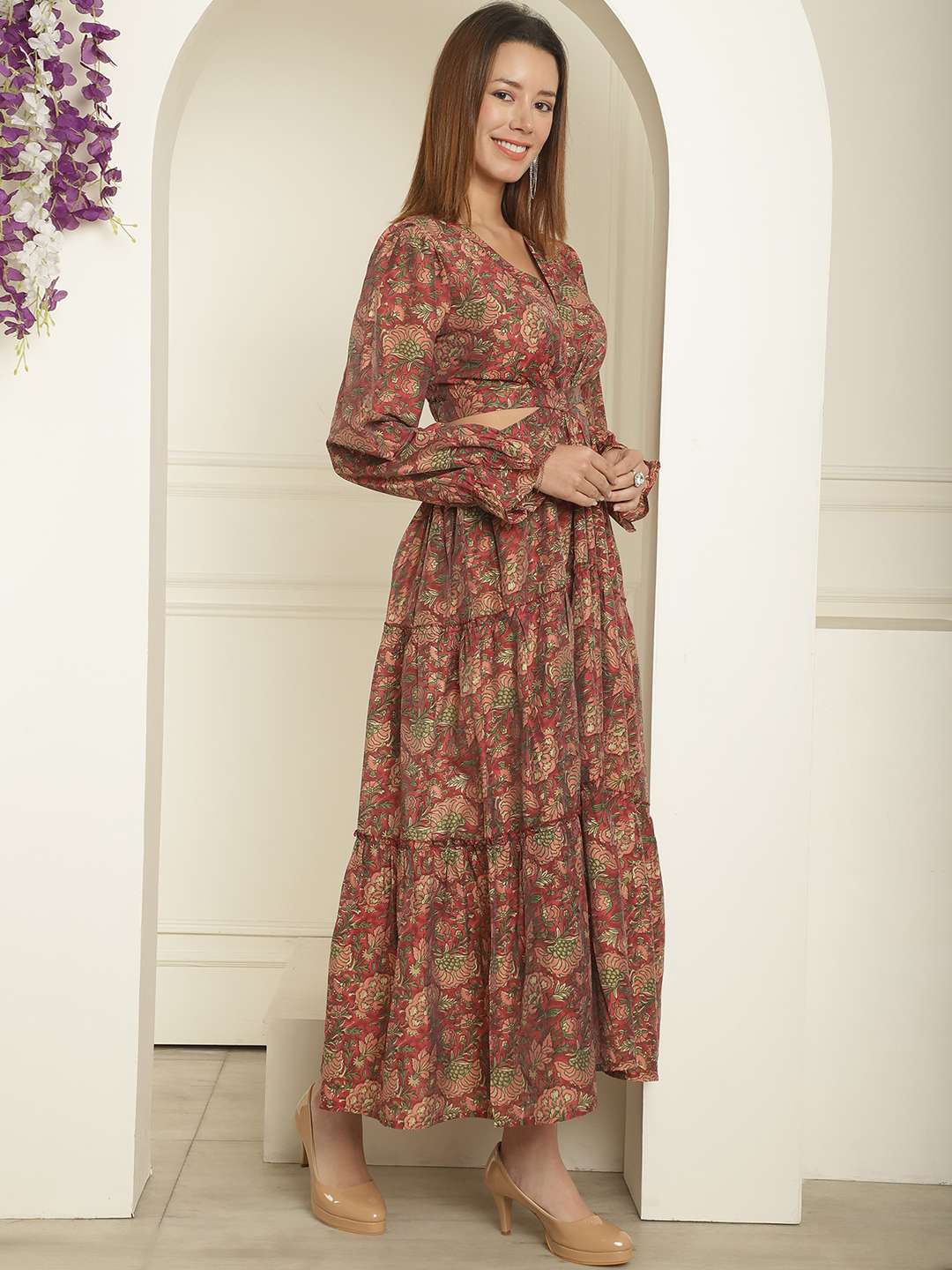 Women’s Silk Printed V-Neck Long Bell Sleeves Tiered Maxi Dress Gown (Dark-Maroon)