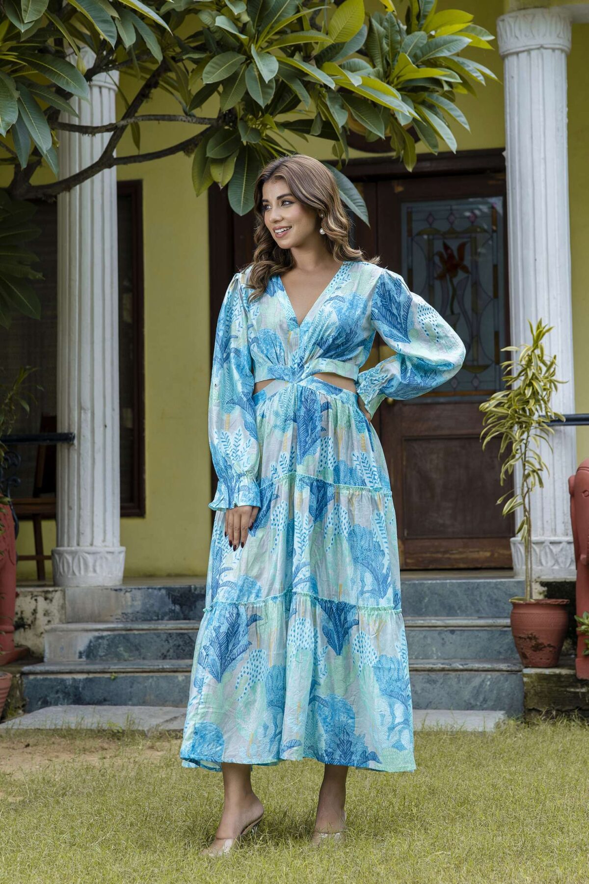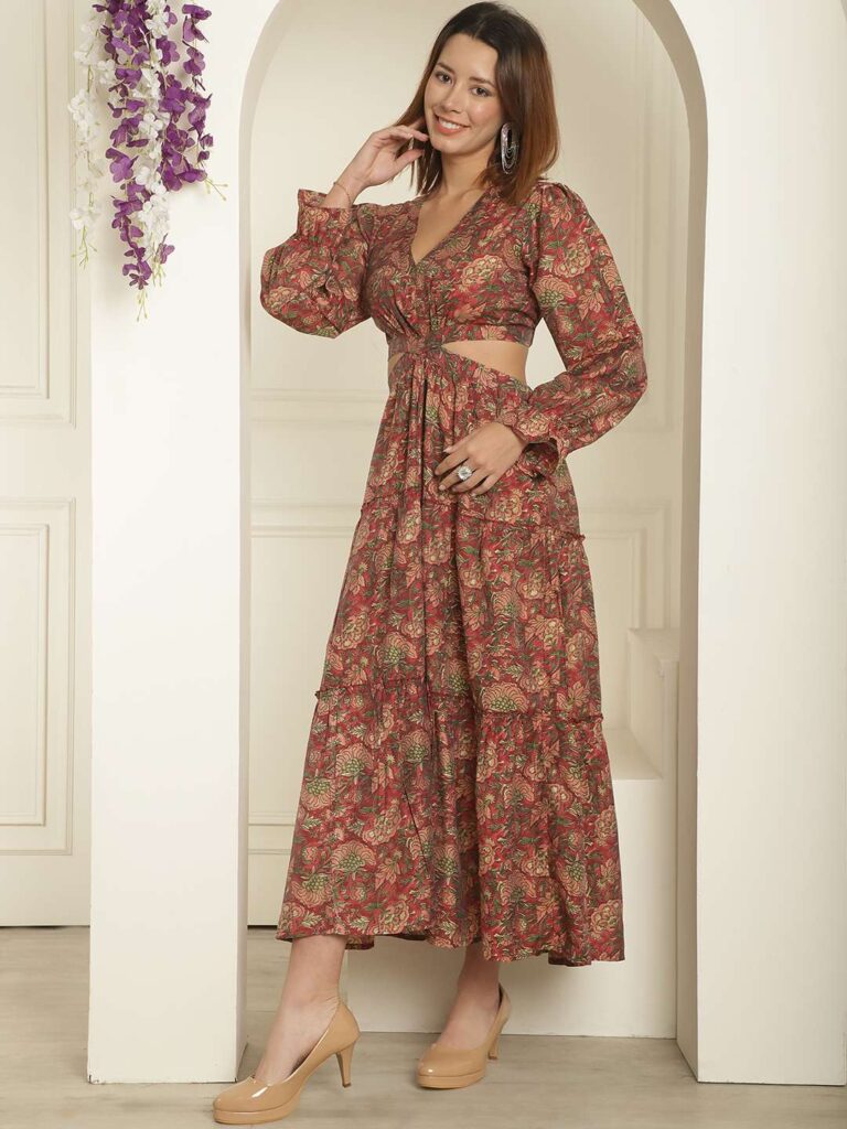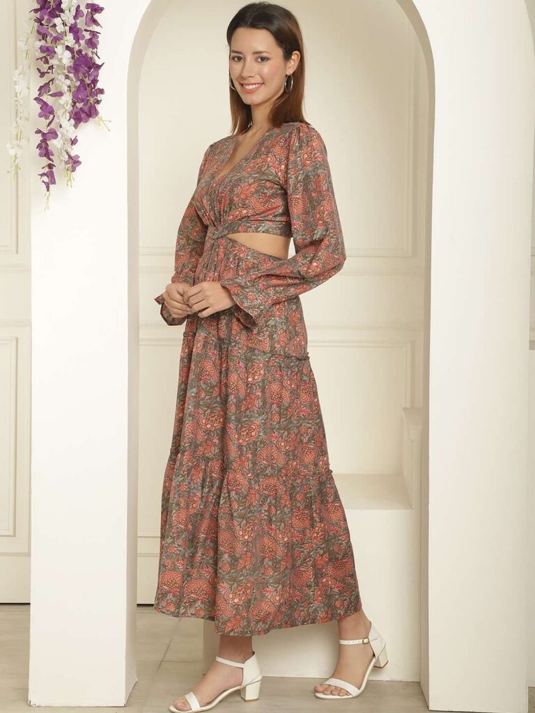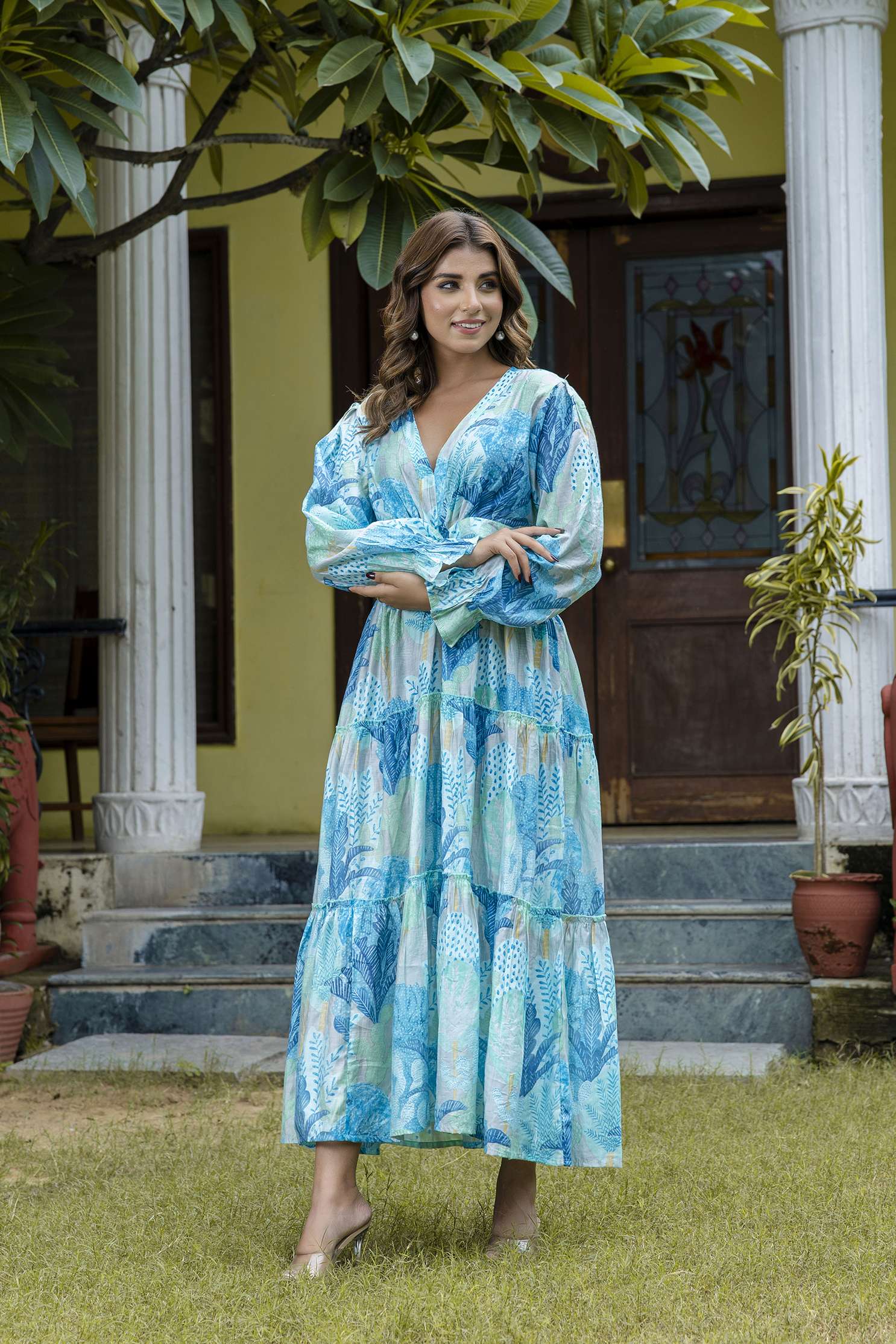 Women’s Silk Printed V-Neck Long Bell Sleeves Tiered Maxi Dress Gown