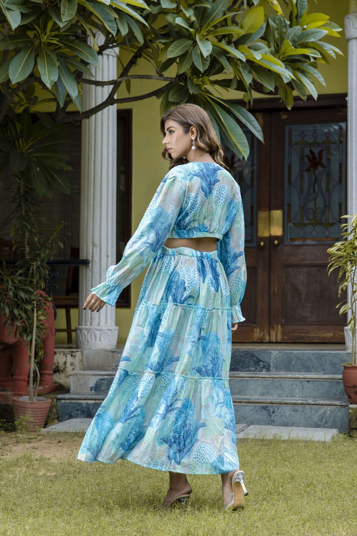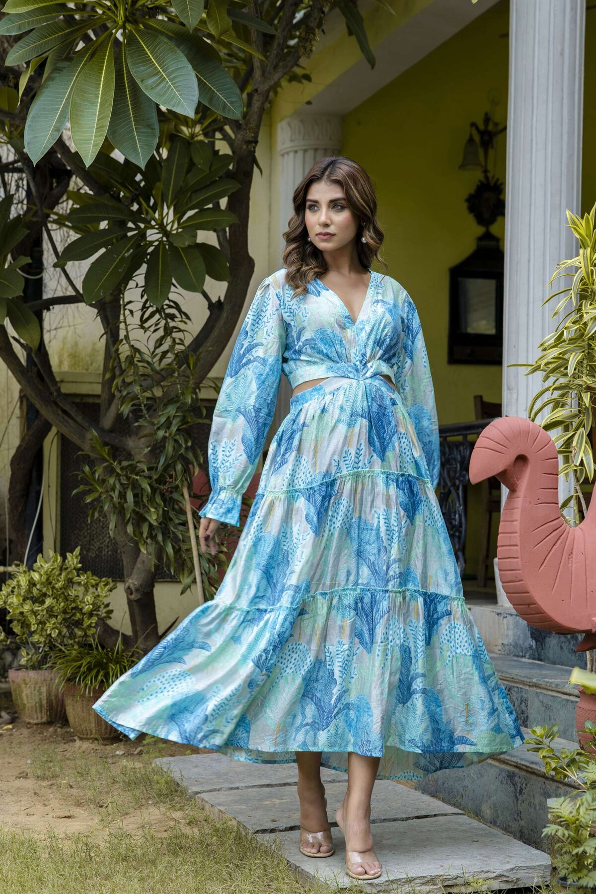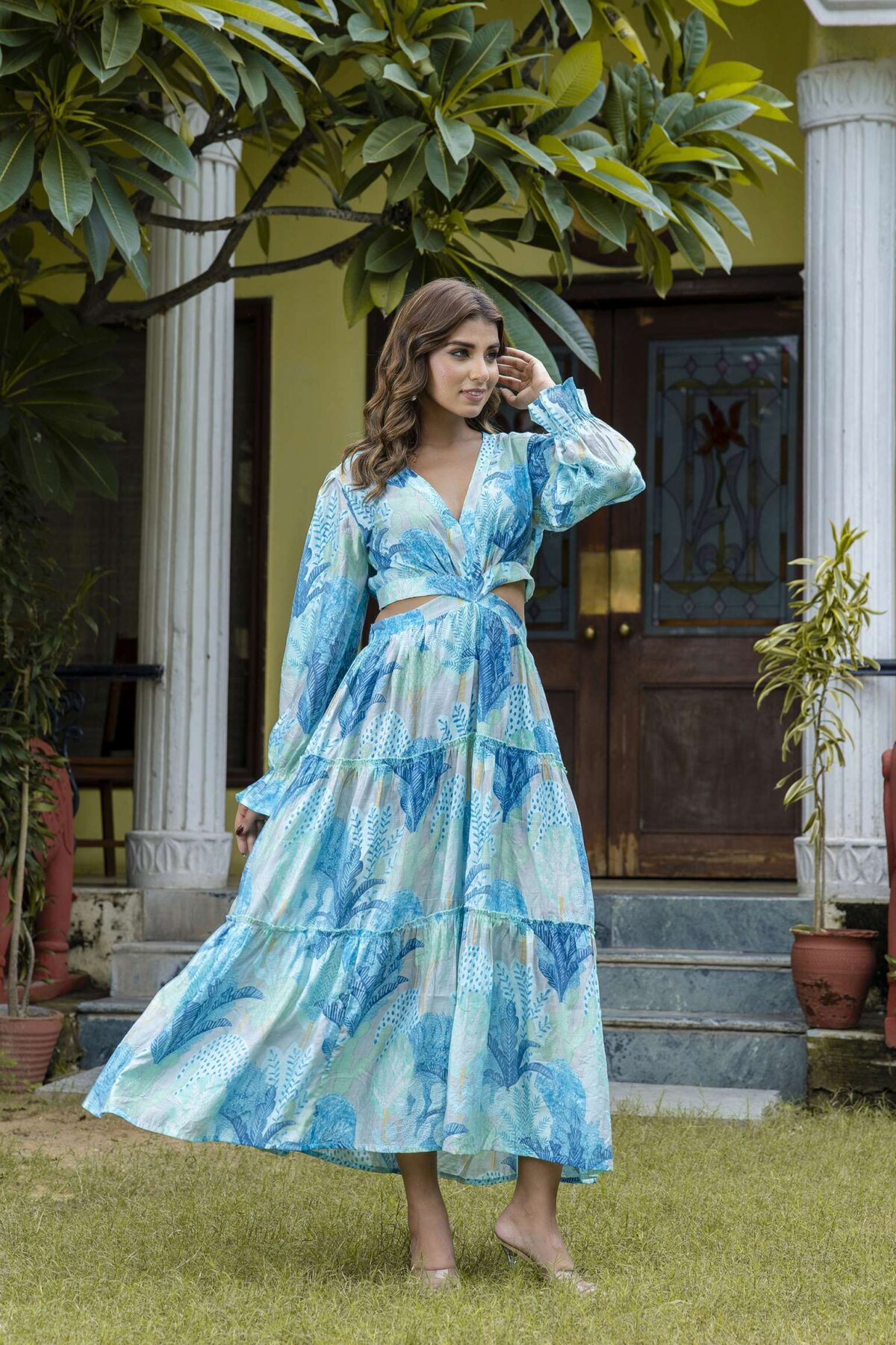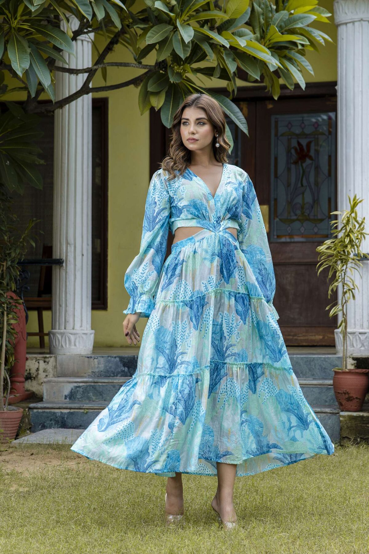 Women’s Silk Printed V-Neck Long Bell Sleeves Tiered Maxi Dress Gown