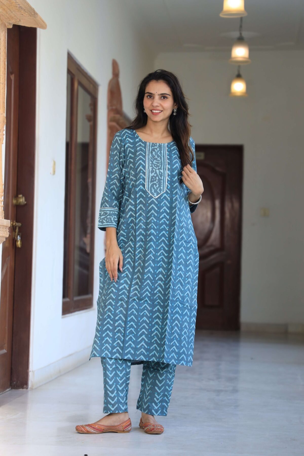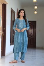Purple printed cotton kurta set, crafted for women who love a balance of tradition and modern style. The kurta features all-over white handblock-inspired circular motifs, paired with a contrast striped yoke design that adds a chic touch to the outfit. Designed with a straight fit and 3/4th sleeves, this set offers effortless comfort and sophistication. The breathable cotton fabric makes it perfect for daily wear, office dressing, festive events, and semi-formal gatherings. It comes with matching printed pants, ensuring a complete coordinated look.