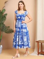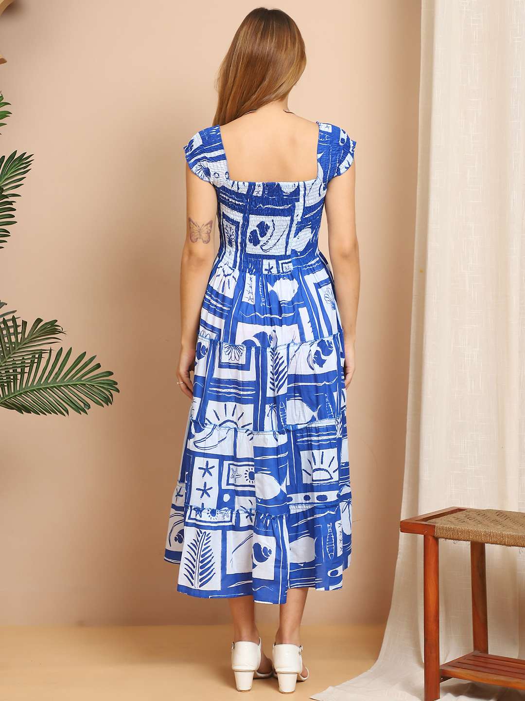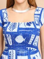 Women’s Viscos Rayon Printed Off Shoulder Midi Dress For Summer And Casual Wear (Blue White)