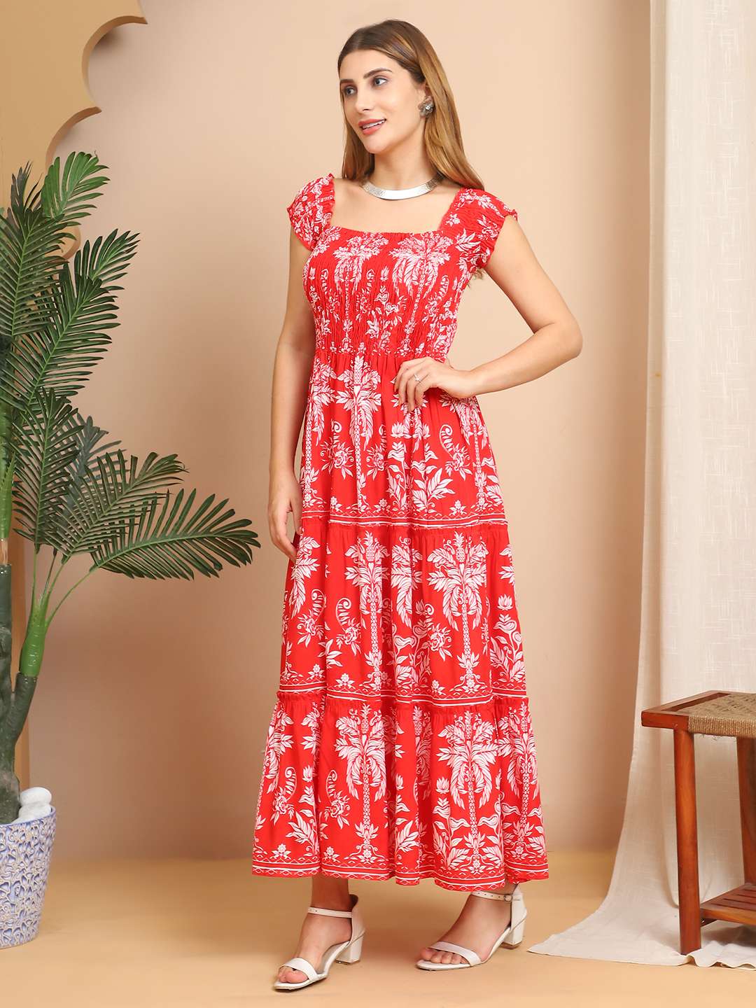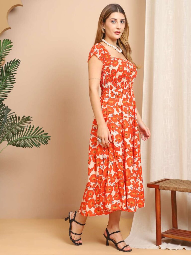 Women’s Viscose Rayon Floral Printed Off-Shoulder Midi Dress, specially designed for summer and casual wear. Crafted from soft and breathable rayon fabric, this dress features a flattering off-shoulder neckline, elegant floral print, and a comfortable midi-length silhouette. Perfect for brunches, vacations, beach outings, or everyday wear.