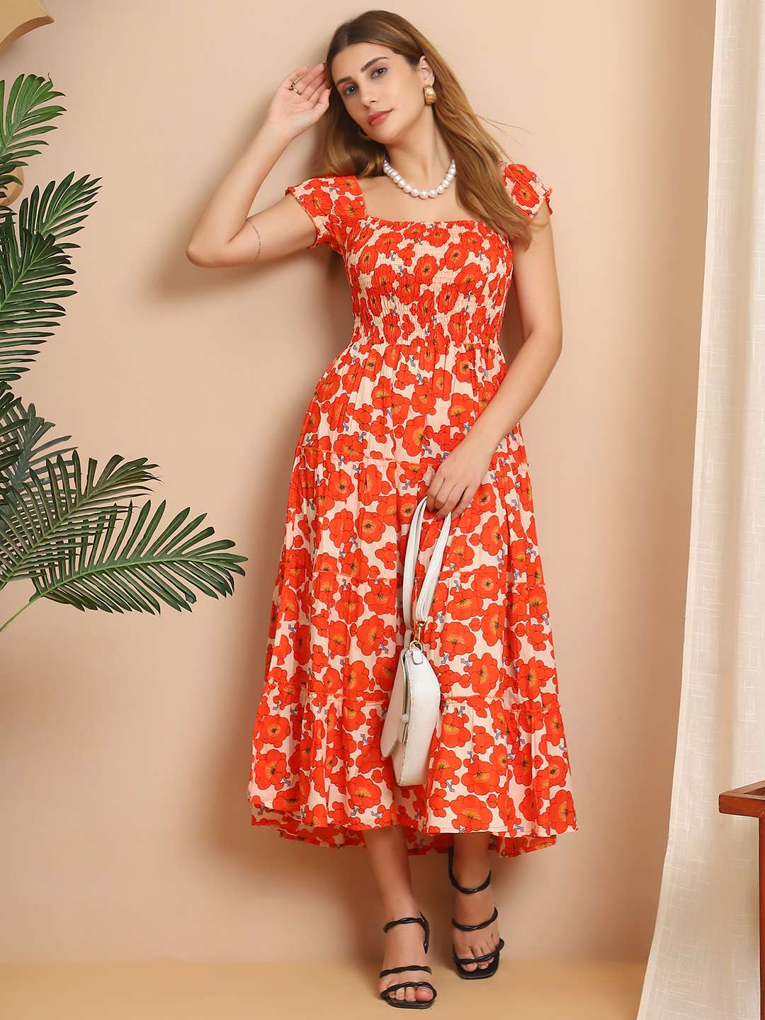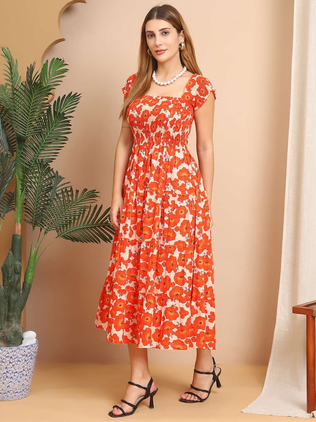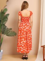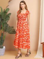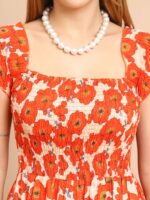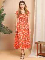 Women’s Viscos Rayon Printed Off Shoulder Midi Dress For Summer And Casual Wear (Orange Floral)