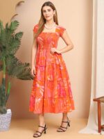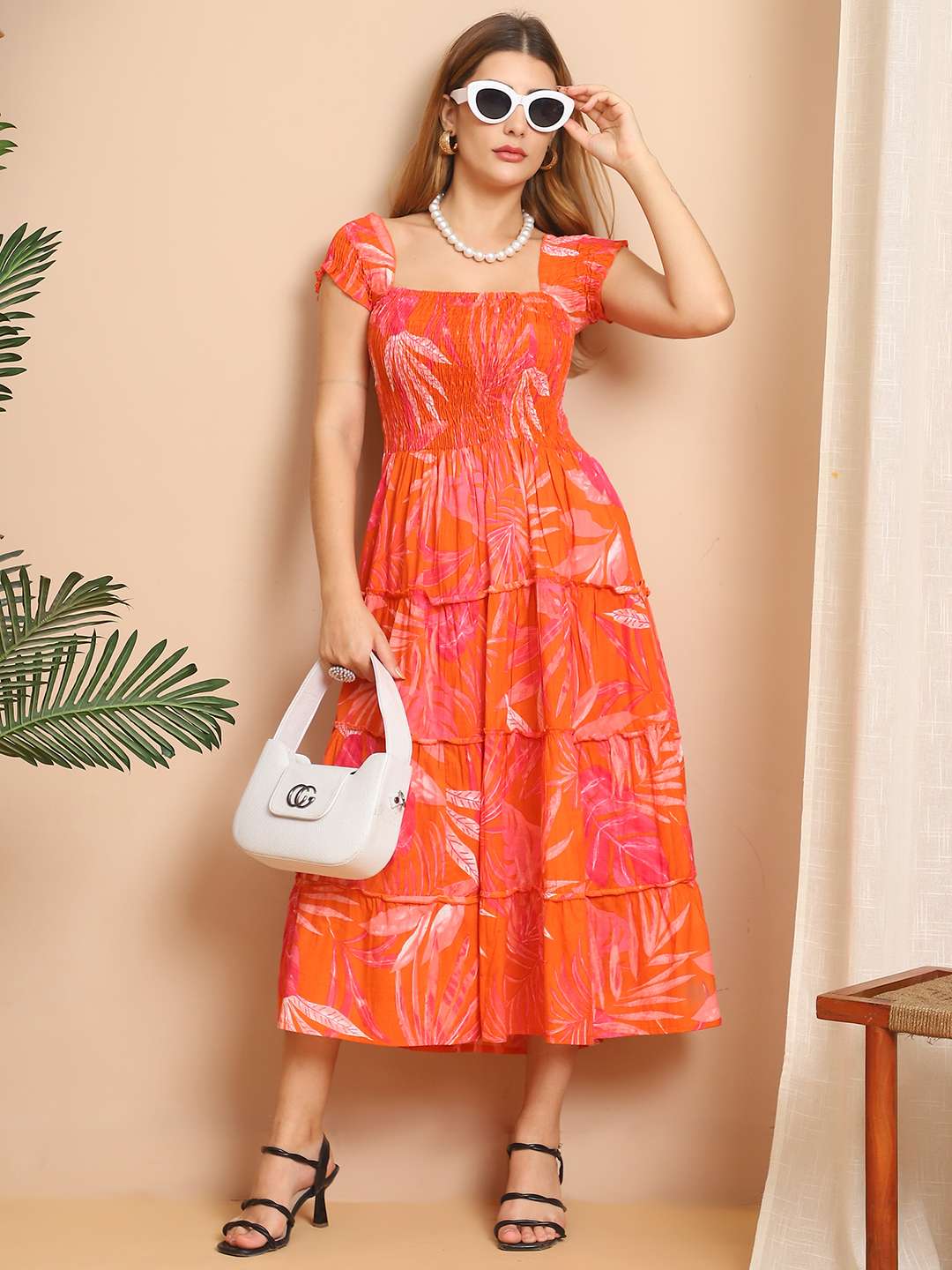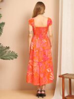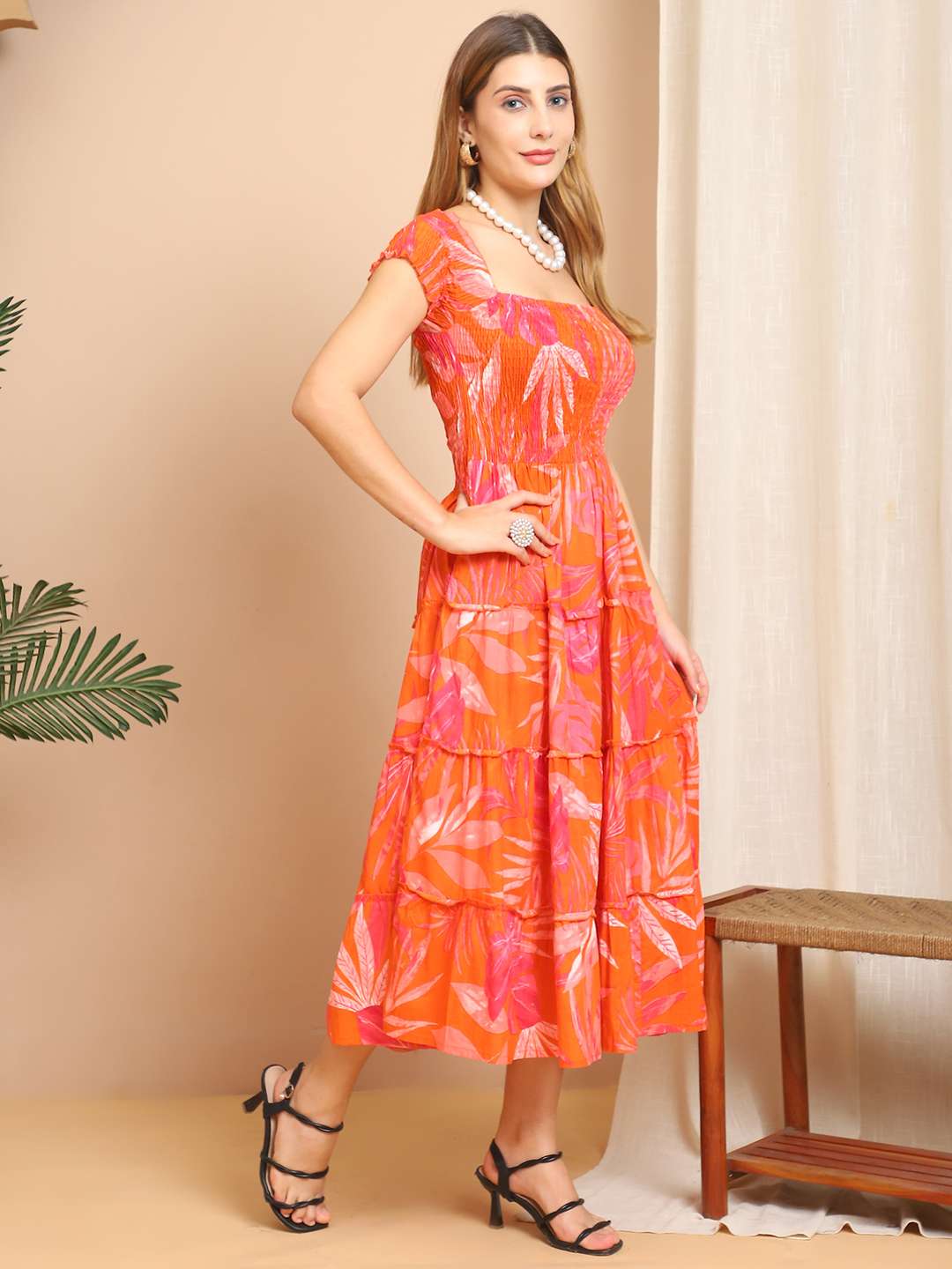 Women’s Viscos Rayon Printed Off Shoulder Midi Dress For Summer And Casual Wear (Orange)