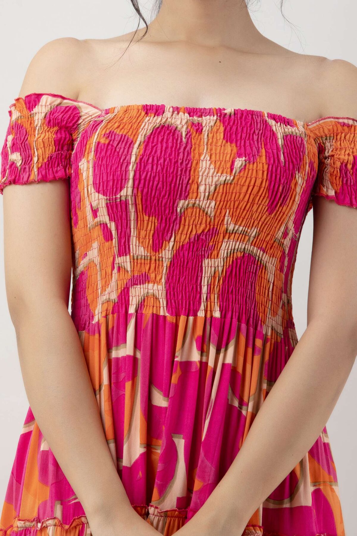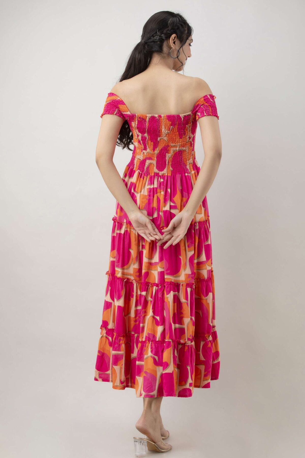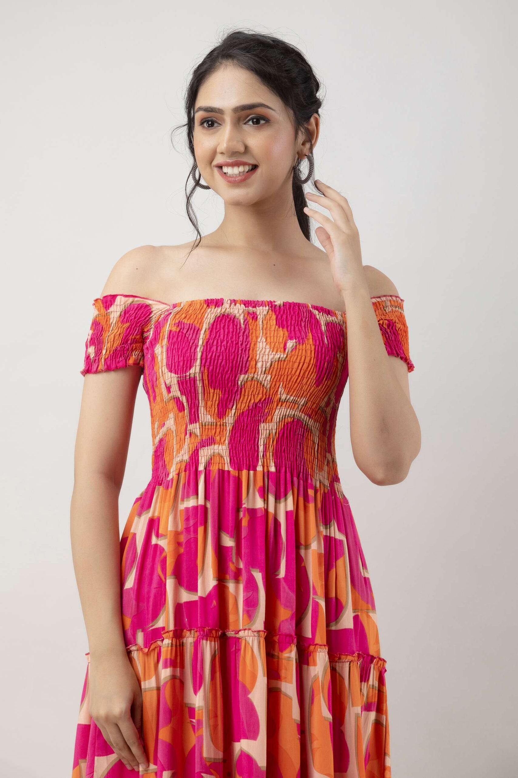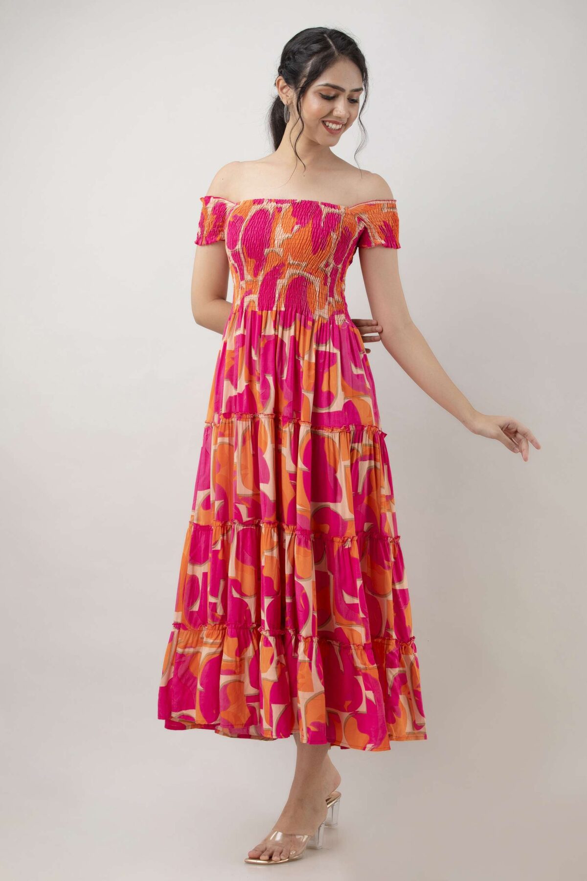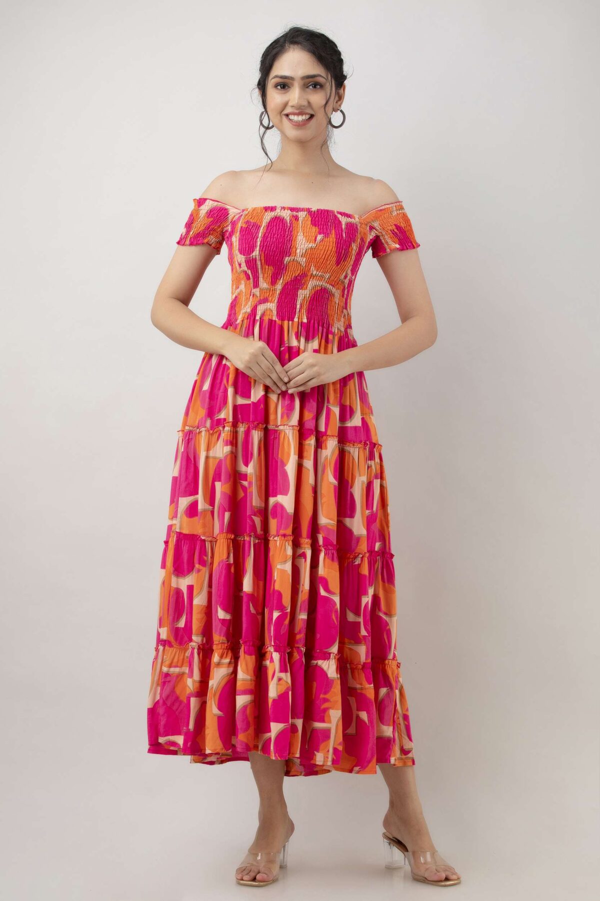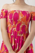 Women’s Viscose Rayon Floral Printed Off-Shoulder Midi Dress, specially designed for summer and casual wear. Crafted from soft and breathable rayon fabric, this dress features a flattering off-shoulder neckline, elegant floral print, and a comfortable midi-length silhouette. Perfect for brunches, vacations, beach outings, or everyday wear.