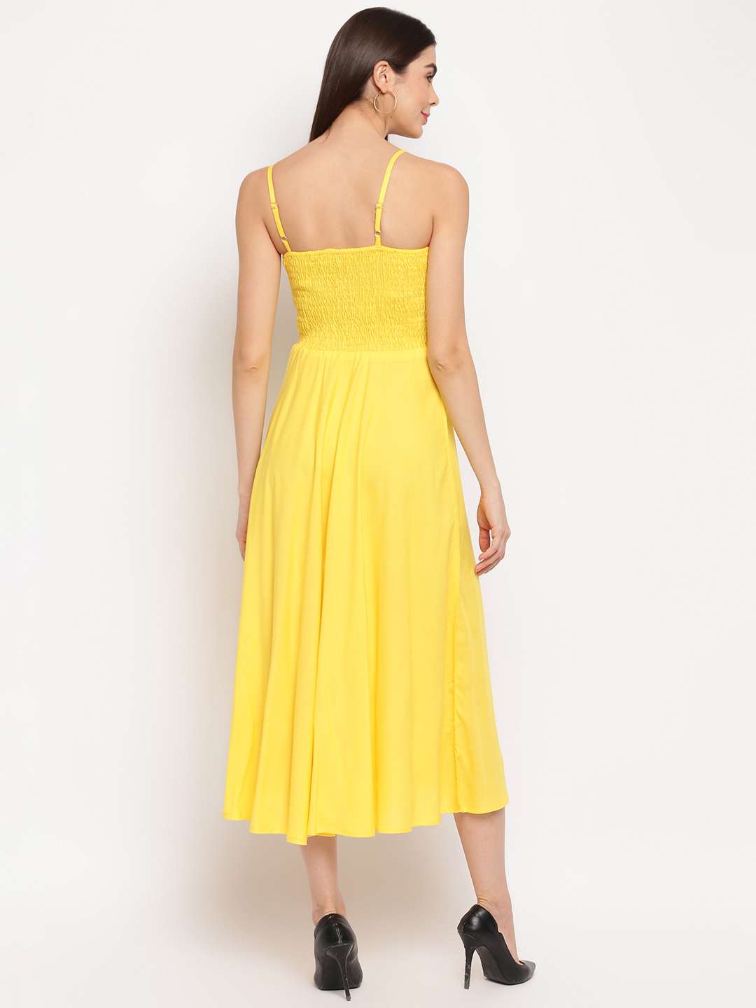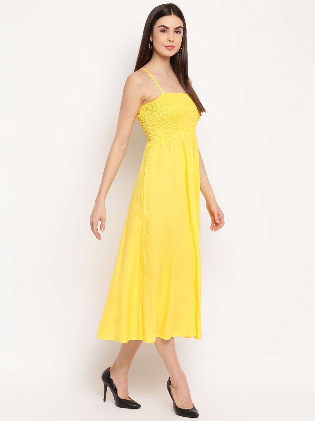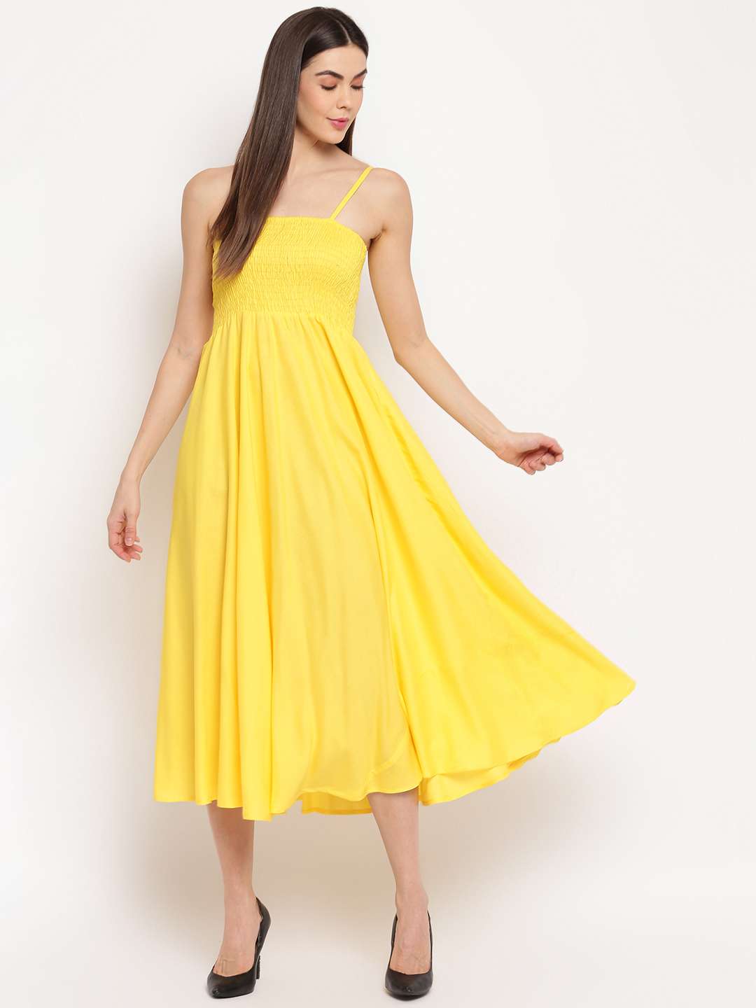 Women’s Viscose Rayon Solid Shoulder Straps Sleeveless Flared Gown Drees (Yellow)