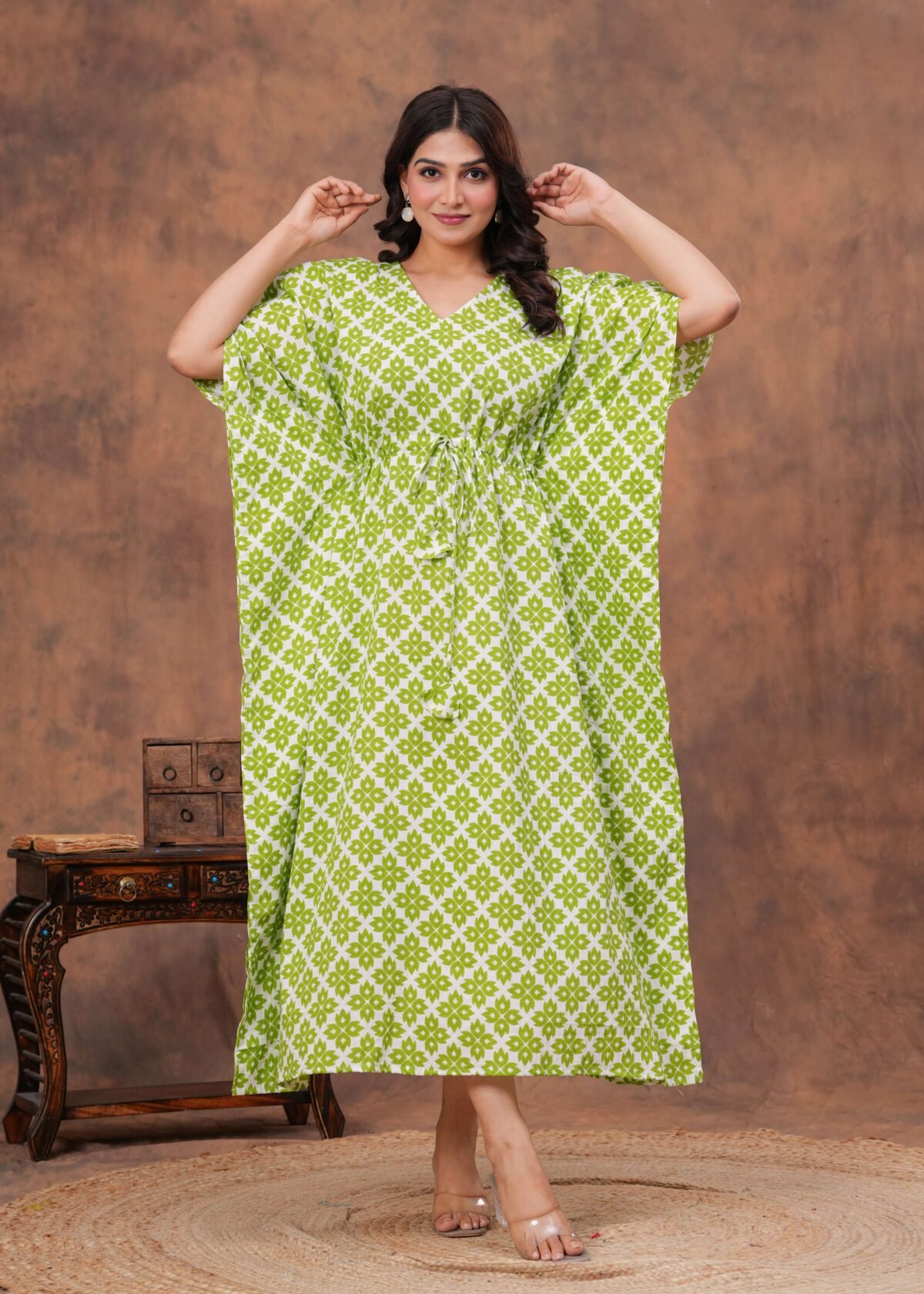 Elevate your everyday style with this beautifully crafted cotton kaftan dress. Designed for comfort and elegance, it features a soft breathable fabric that feels gentle on the skin, making it perfect for all-day wear. The relaxed fit is enhanced with a drawstring waist, allowing you to adjust the silhouette for a flattering look. With its stylish print and flowing design, this kaftan is ideal for lounging at home, casual outings, or vacation wear.