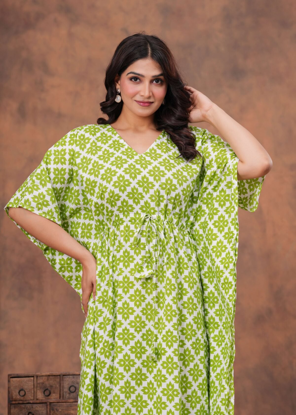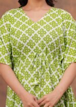 Women’s White & Green Cotton Printed Kaftan Dress with Drawstring Waist
