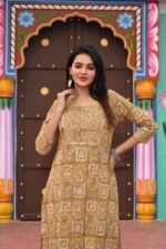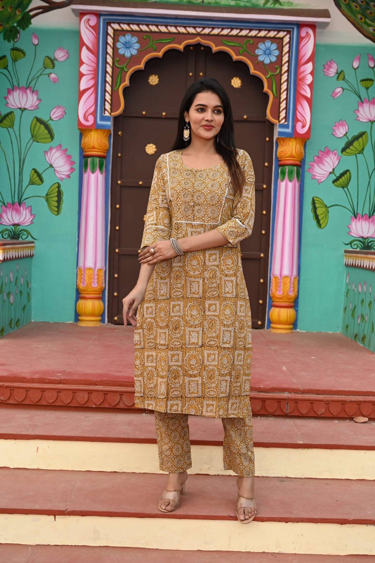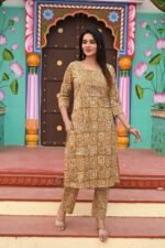 black printed cotton kurta set, crafted for women who love a balance of tradition and modern style. The kurta features all-over white handblock-inspired circular motifs, paired with a contrast striped yoke design that adds a chic touch to the outfit. Designed with a straight fit and 3/4th sleeves, this set offers effortless comfort and sophistication. The breathable cotton fabric makes it perfect for daily wear, office dressing, festive events, and semi-formal gatherings. It comes with matching printed pants, ensuring a complete coordinated look.