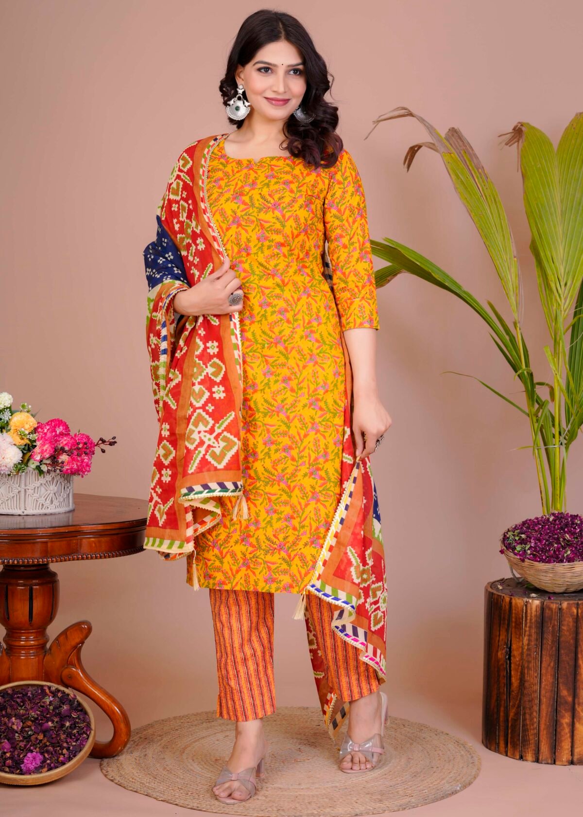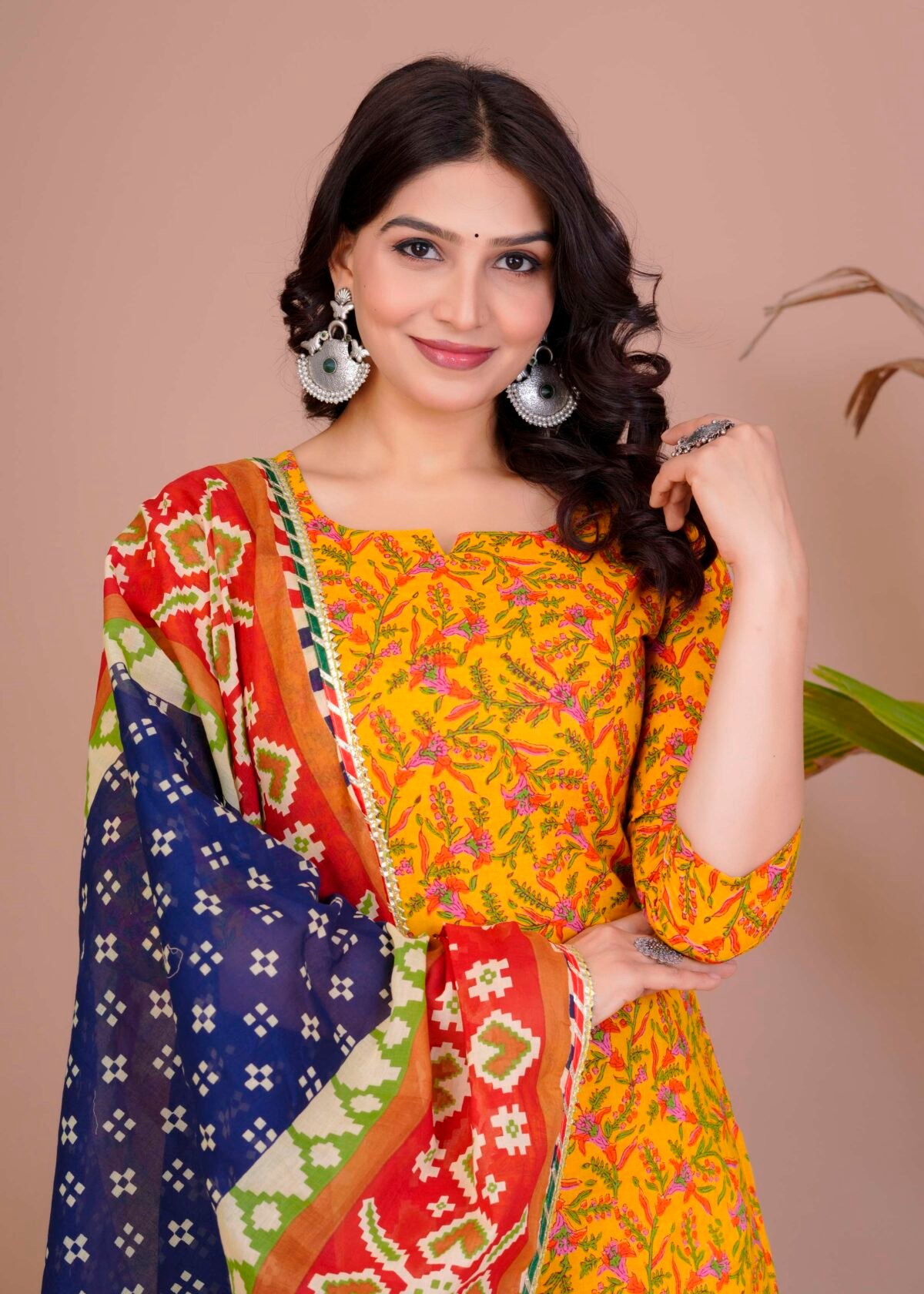 Women’s Yellow Cotton Printed Straight Kurti with Pant & Dupatta Set