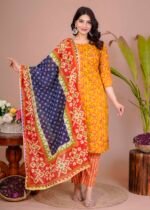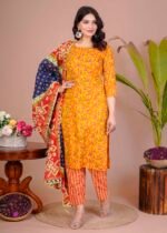 Ethnic wardrobe with this beautifully designed cotton straight kurti set with pant and dupatta. Crafted from breathable cotton fabric, this outfit ensures all-day comfort while giving you a graceful and stylish look. The straight kurti is adorned with intricate prints, paired with a matching pant and a lightweight dupatta that adds elegance to the ensemble. Perfect for casual outings, festive occasions, or office wear, this cotton kurti set offers both comfort and sophistication.