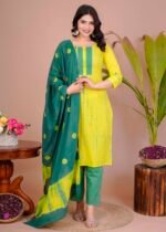 Women’s Yellow & Green Cotton Tie-Dye Straight Kurti with Pant & Dupatta Set