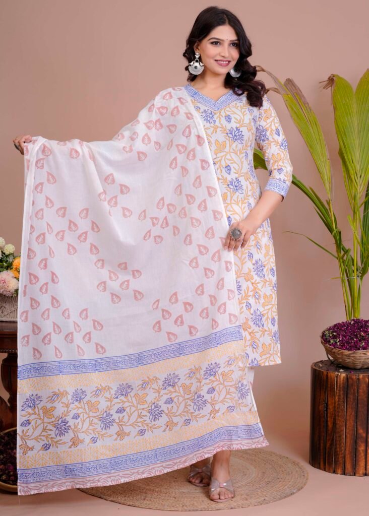 Ethnic wardrobe with this beautifully designed cotton straight kurti set with pant and dupatta. Crafted from breathable cotton fabric, this outfit ensures all-day comfort while giving you a graceful and stylish look. The straight kurti is adorned with intricate prints, paired with a matching pant and a lightweight dupatta that adds elegance to the ensemble. Perfect for casual outings, festive occasions, or office wear, this cotton kurti set offers both comfort and sophistication.