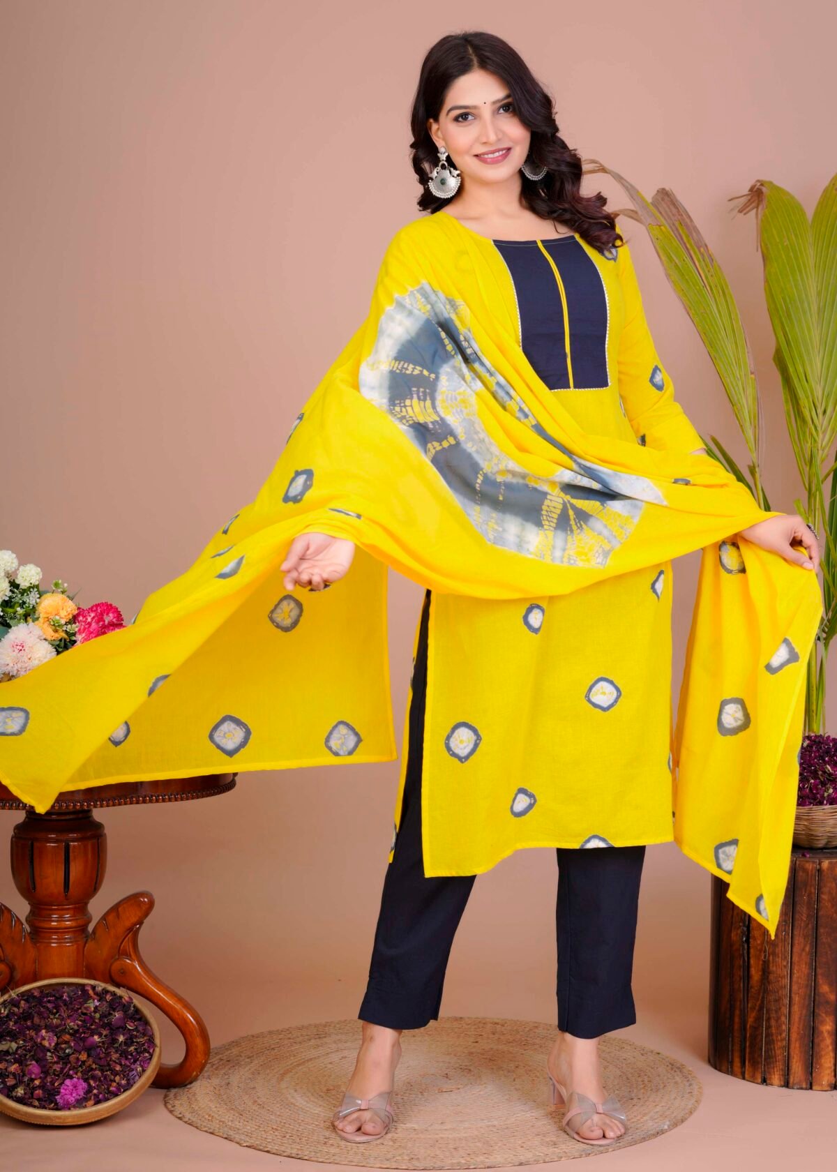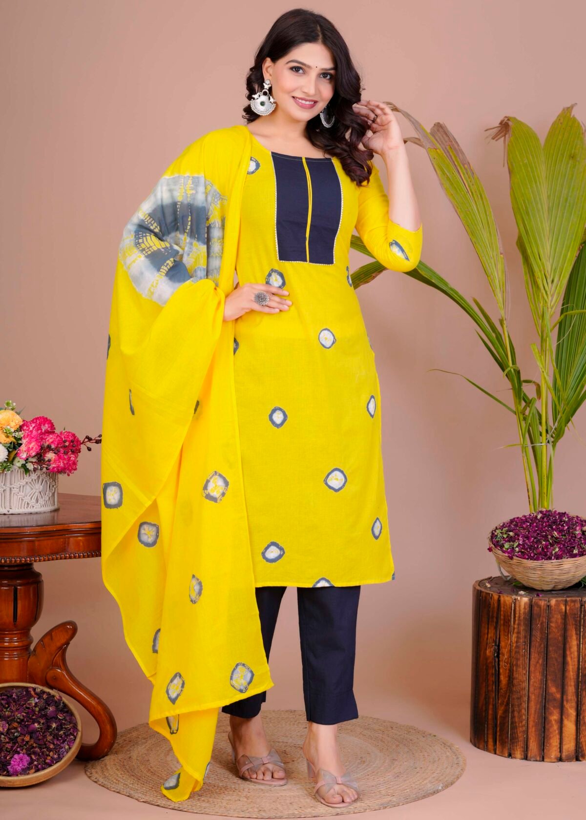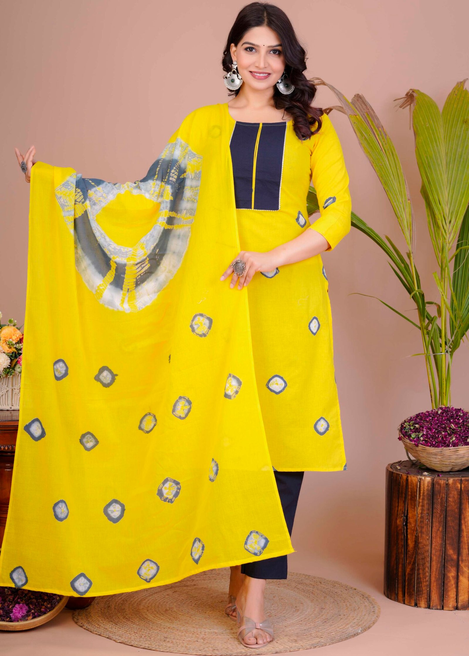 Women’s Yellow & Navy Cotton Tie-Dye Straight Kurti with Pant & Dupatta Set