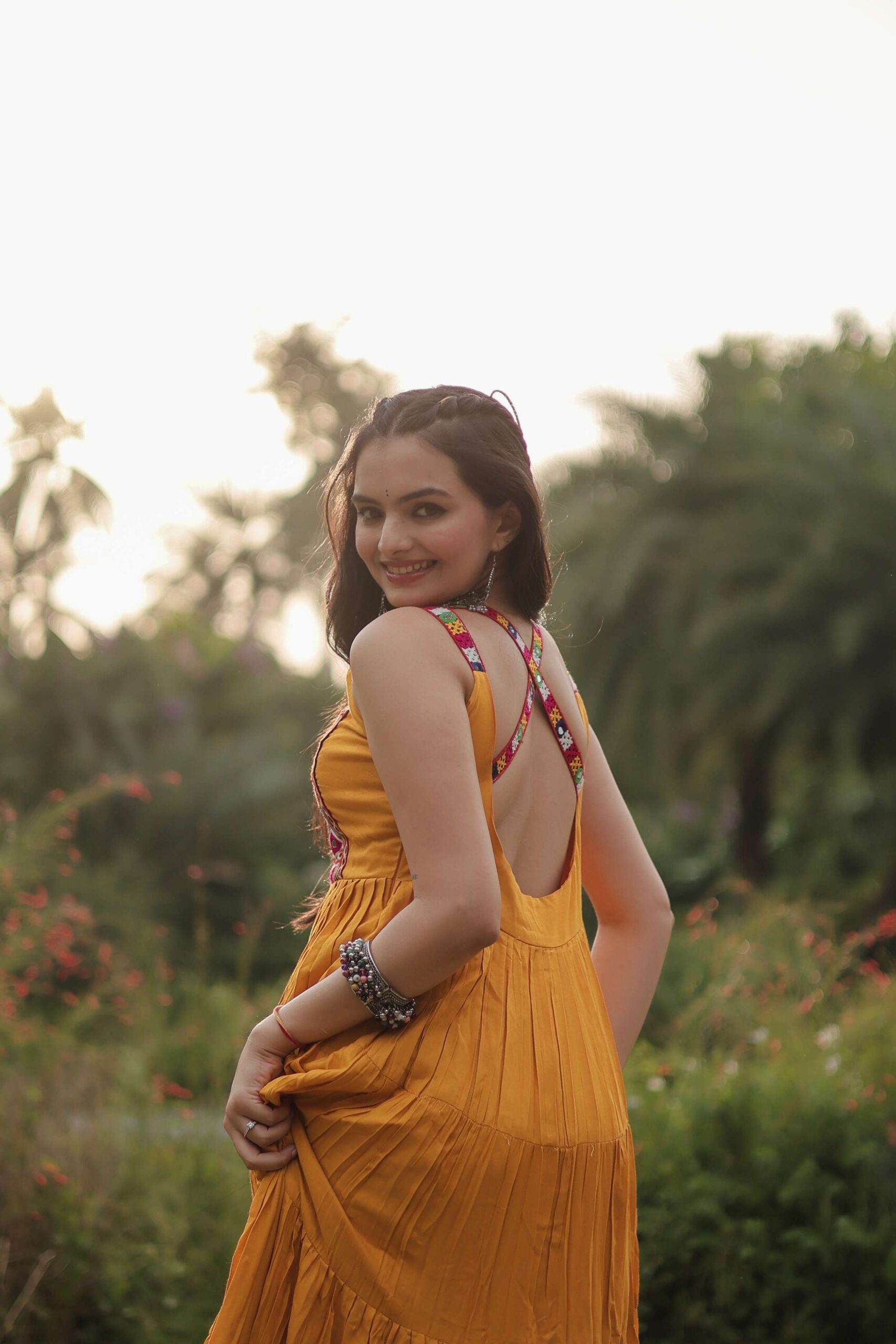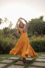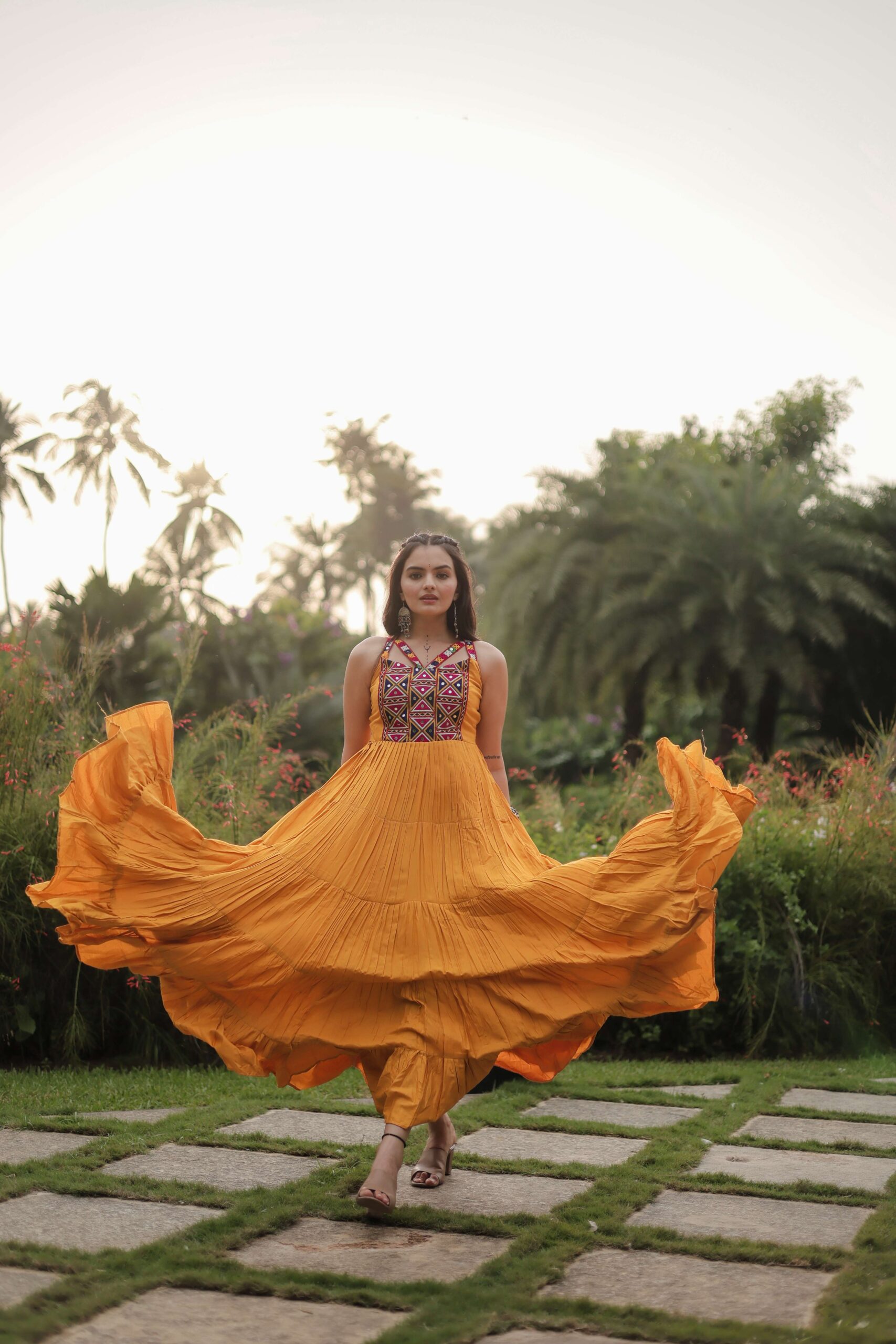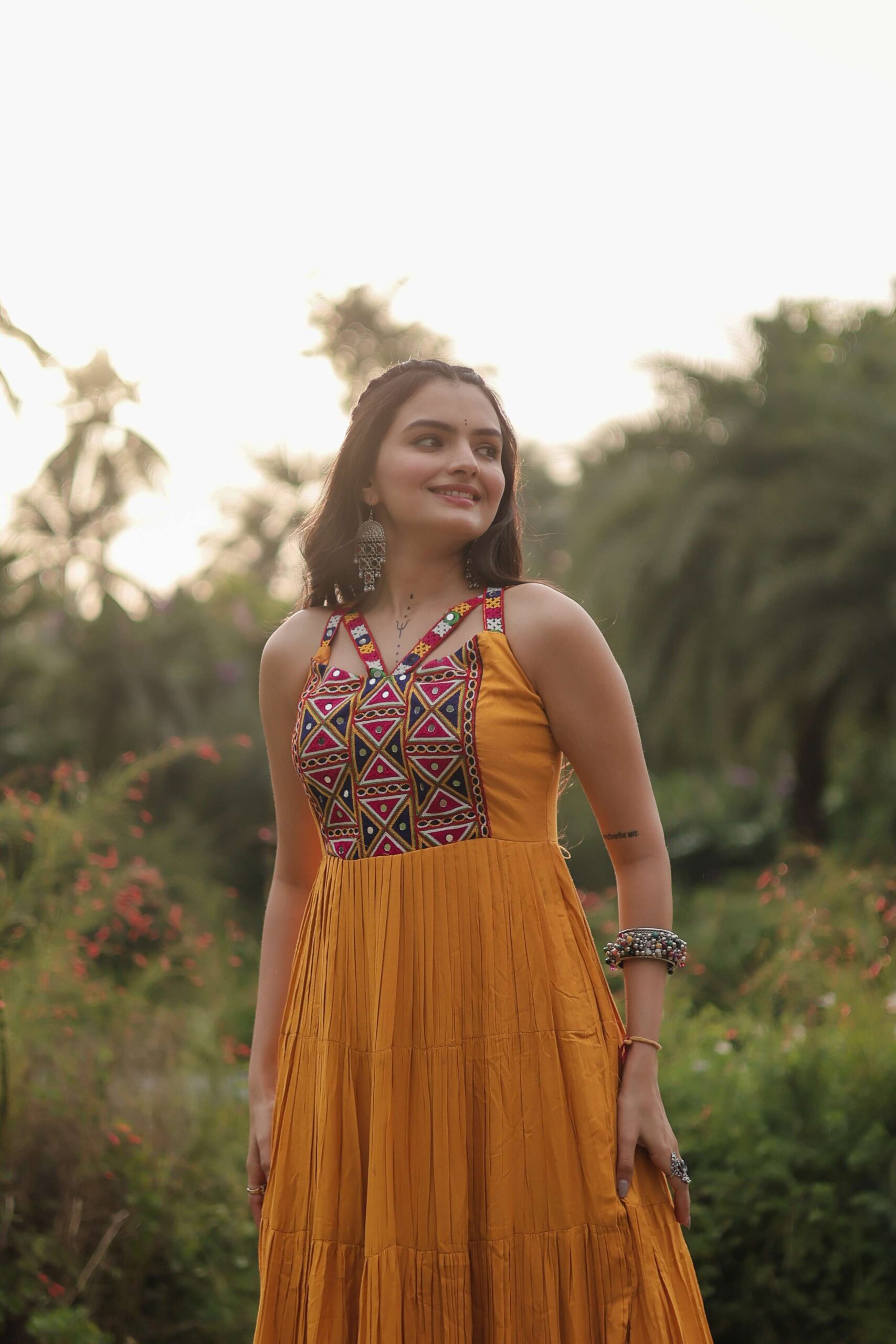 With 12 meters of flowing flair and 5-layer gathering stitching, this gown ensures a striking silhouette perfect for Garba, Dandiya, and festive occasions. The full-length cotton lining provides comfort for hours of celebration, making it an ideal combination of style and functionality.