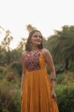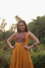 Step into the festive spirit with this premium Navratri gown crafted from 14 kg Reyon fabric and detailed with traditional Kutchi Gamthi embroidery. The gown features a fully adjustable size, allowing a comfortable fit from 38″ to 44″, and a flattering fancy neck design at both front and back.